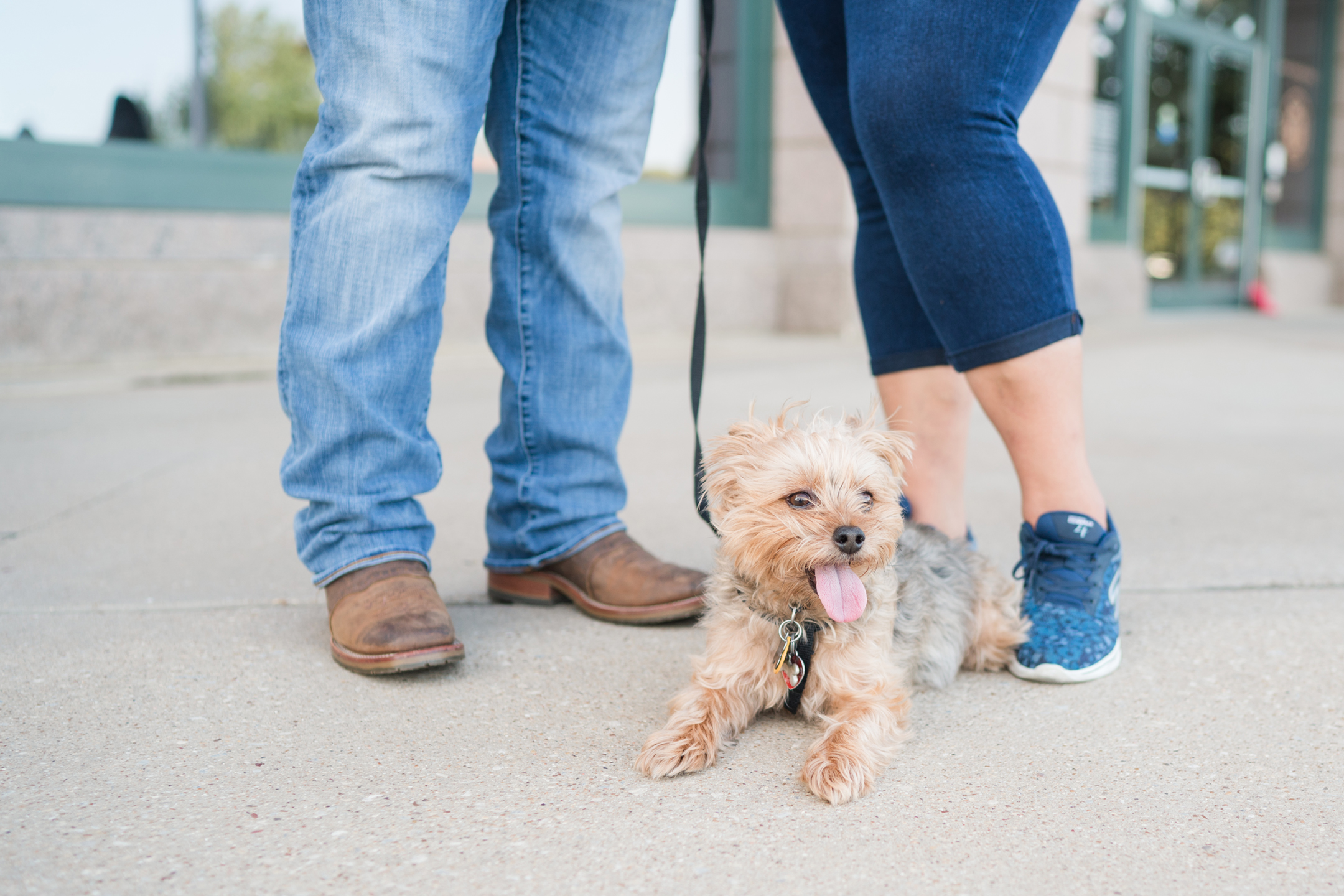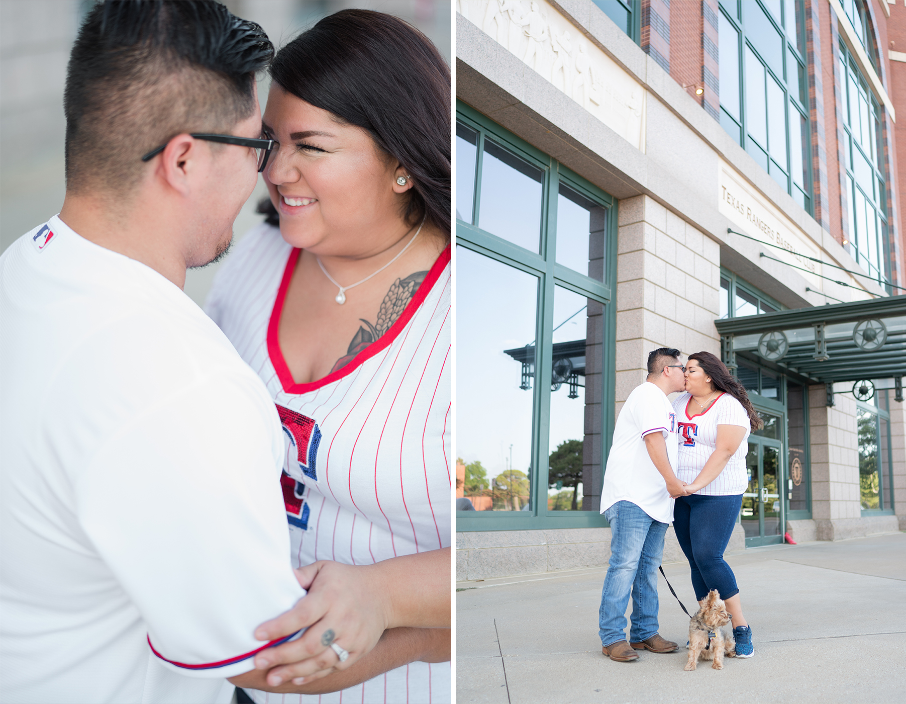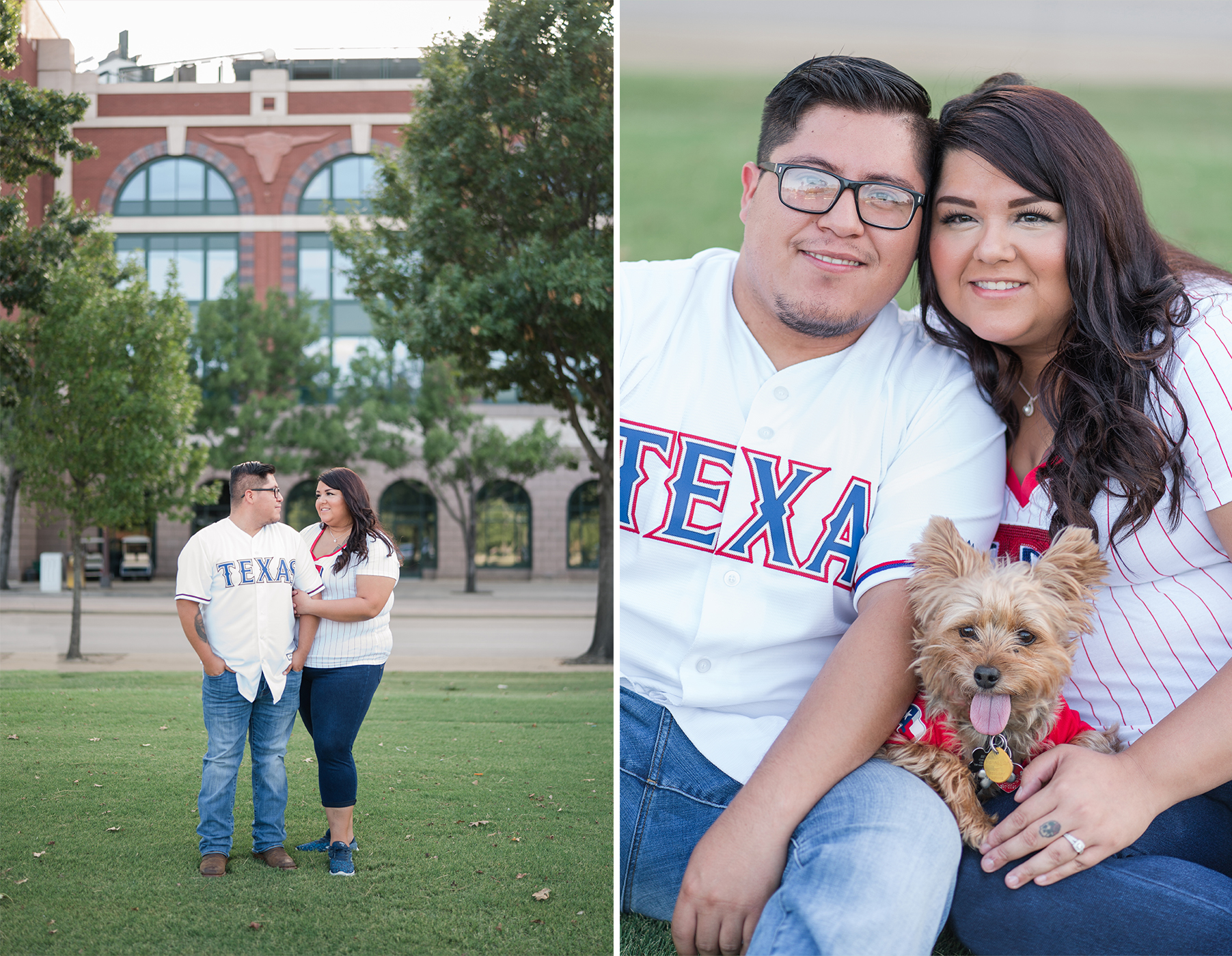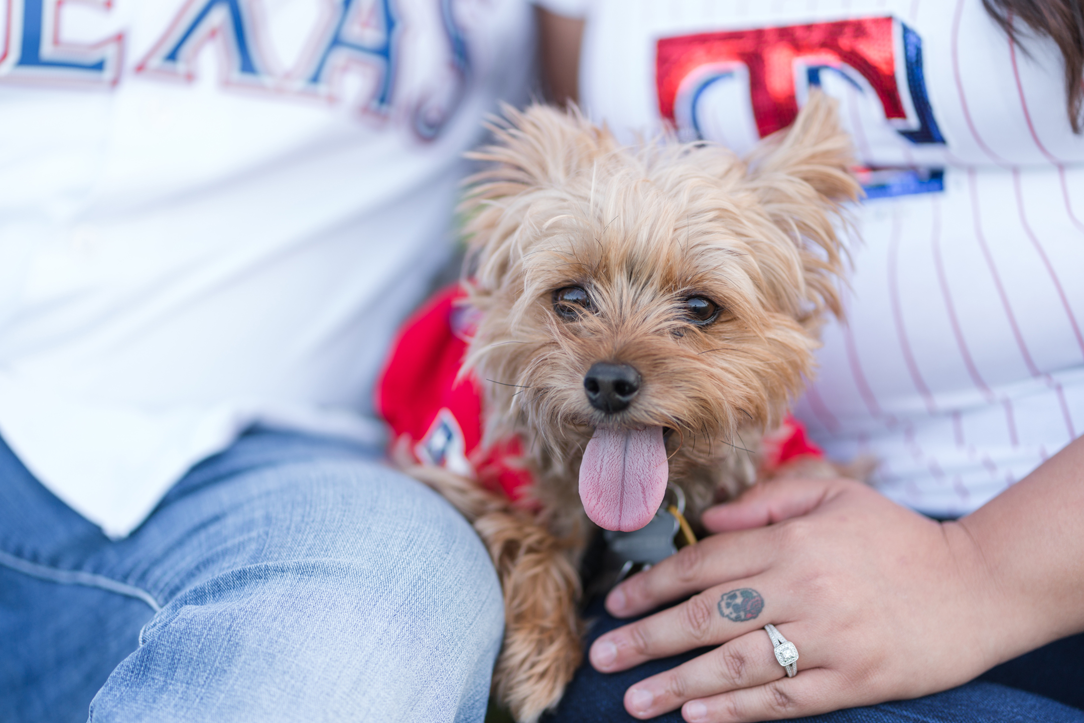 Where do you go for an engagement session if you are a big Texas Ranger Fan you ask?!  Globe Life Park in Arlington!  Christina and I got to hang out prior to our session and not only her but Butters too!  This little guy is waaayyyy too cute!  I was looking forward to meeting Salvador since he wasn’t able to hang out with us a few months ago.  They were Ranger Tastic when they arrived.  It totally slipped my mind that Butters was going to be joining us.  My voice raised like 10 octaves and I said, “AHHHH Butters is here!”  When Christina and I were discussing potential engagement session dates, I gave her a list of dates of when the Rangers were at an away game and her response was, oh we could have had the session then went to a game!  This is the best statement ever!  I heart the Rangers!  🙂