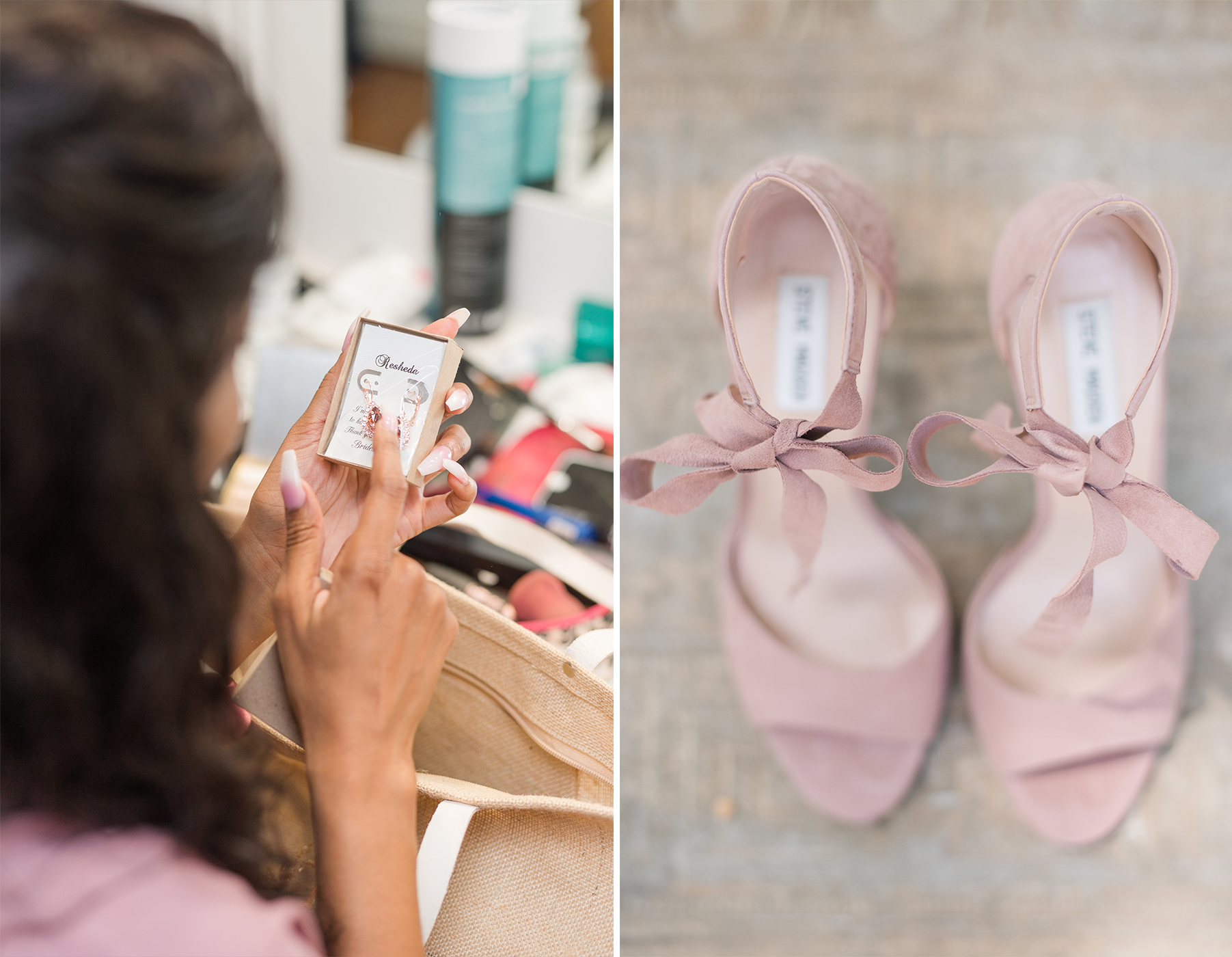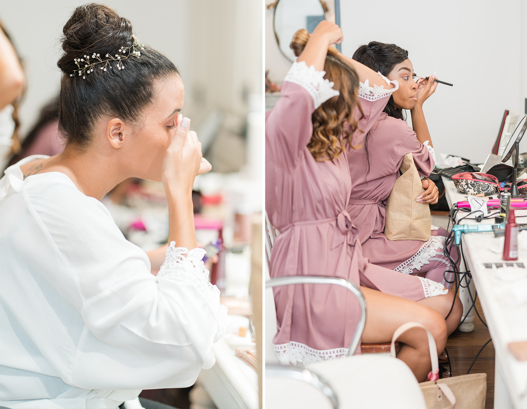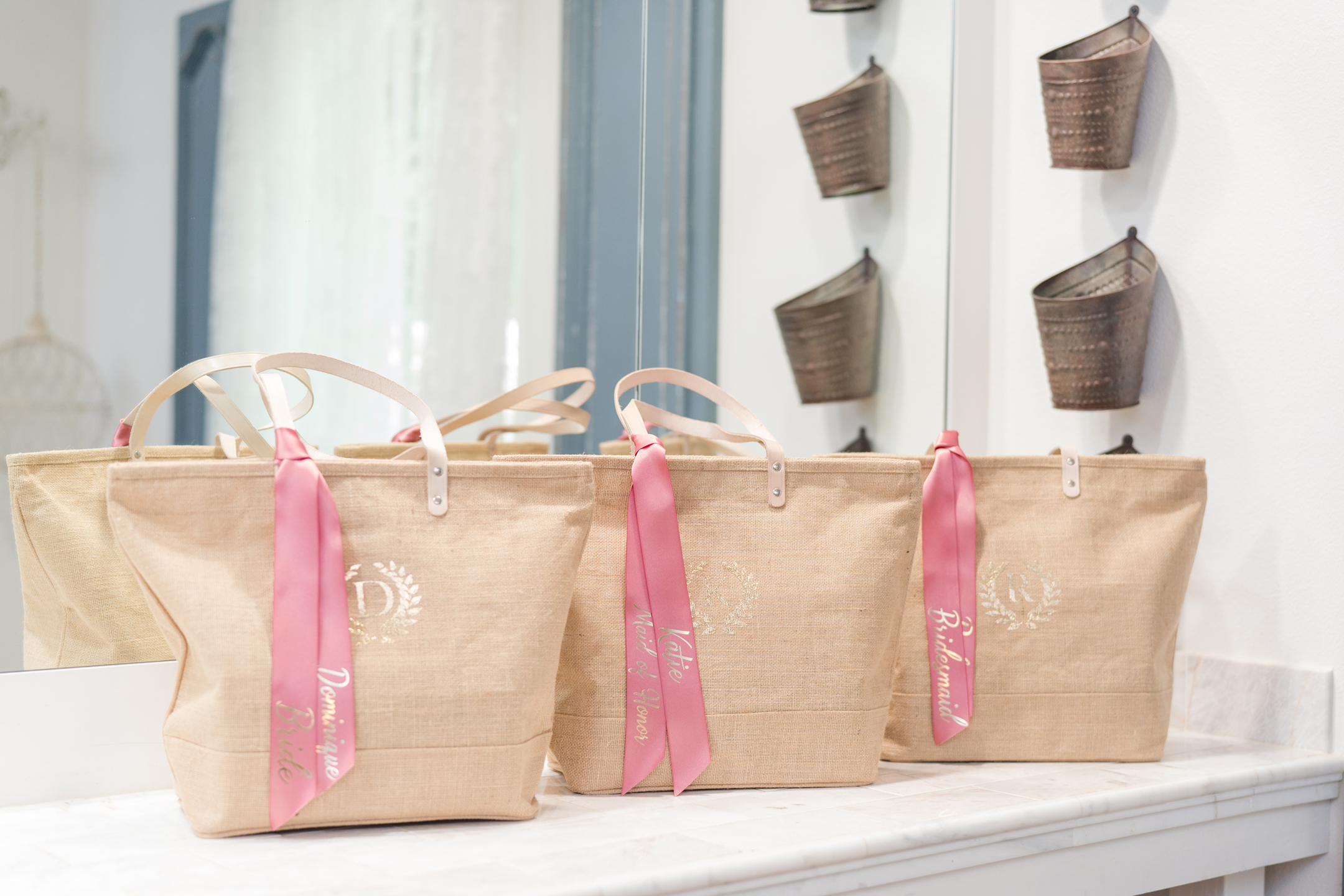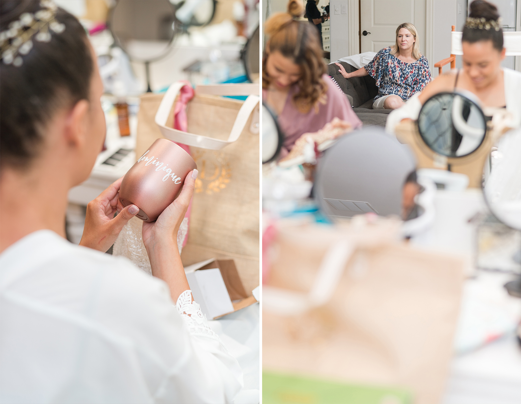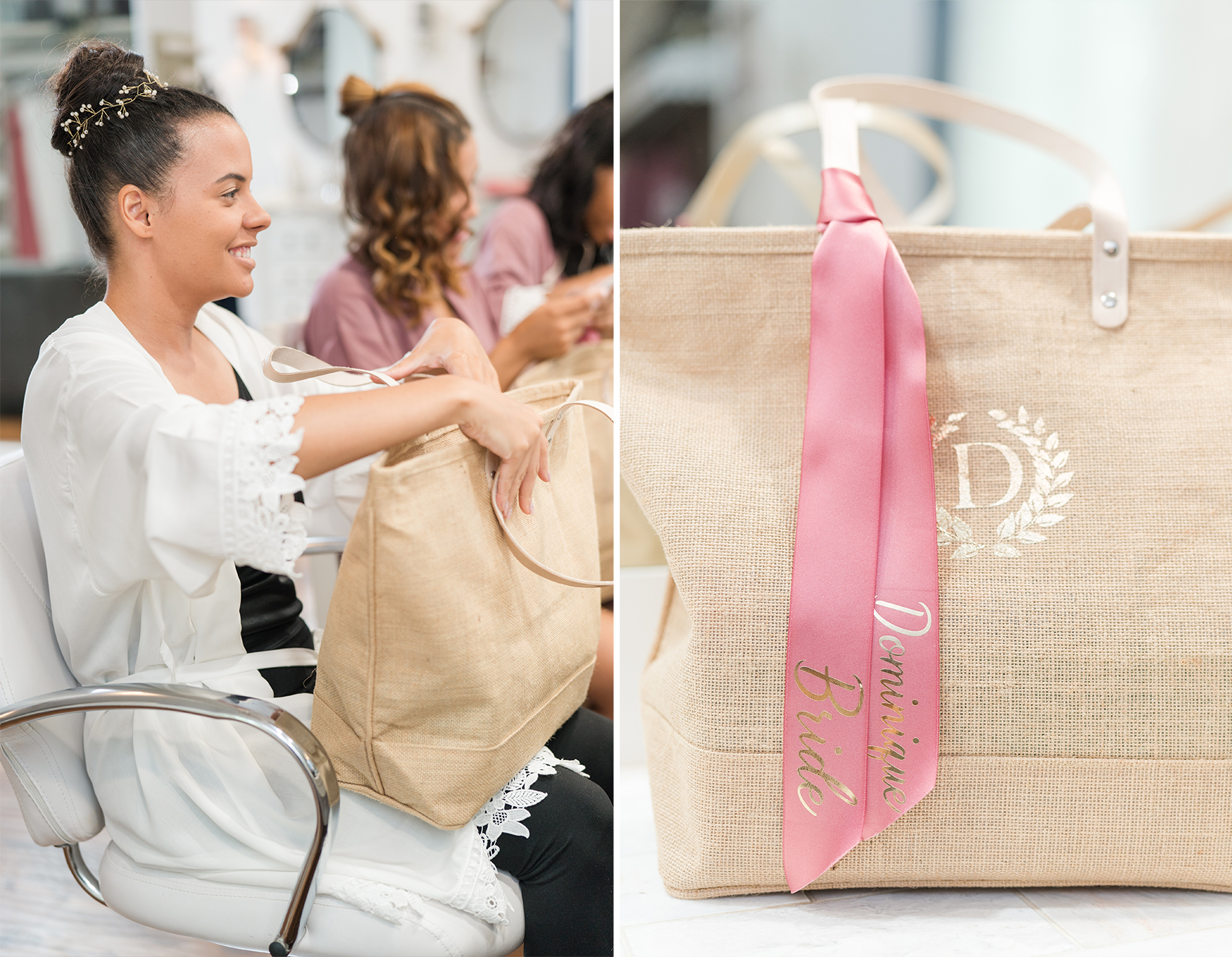 Seeing two families come together to make a wonderful day for a Bride and Groom is one of my favorite things in the world. Dominique’s mom should be a wedding decor expert! Didn’t she do an awesome job of decorating?! I was blown away! Dominique and her bridesmaids were relaxing in the bridal suite and were so welcoming and sweet! Love how close these girls are with each other. Before make-up began, each one of them had a bag specifically made for them by Dominque’s mom DeAnne! Love that!