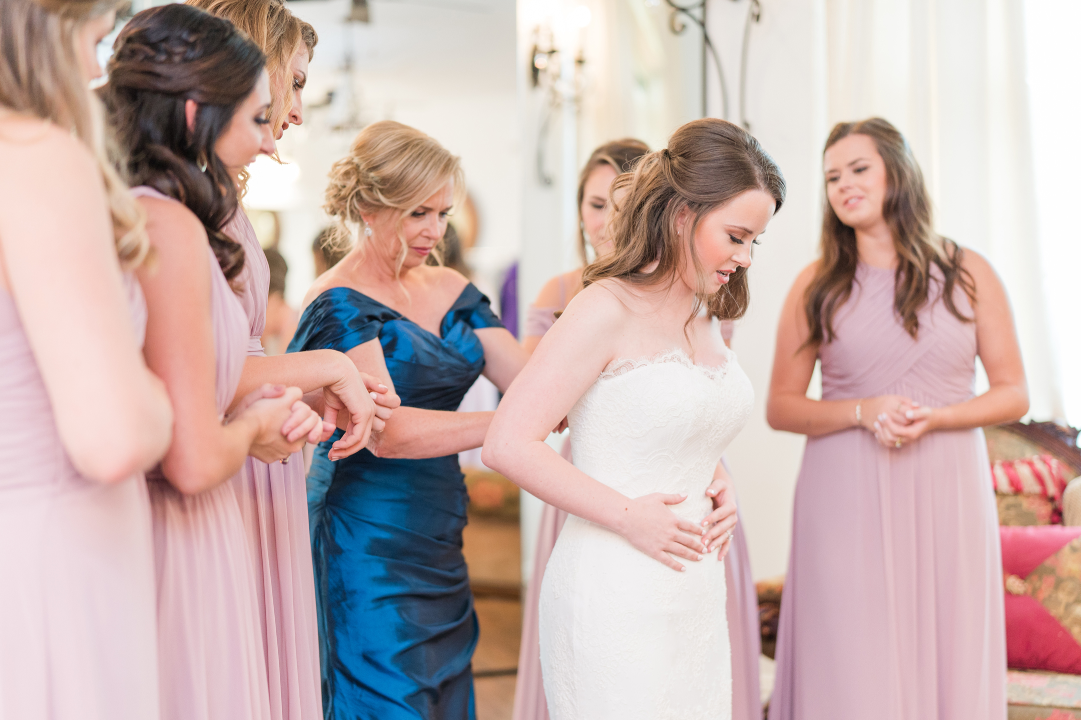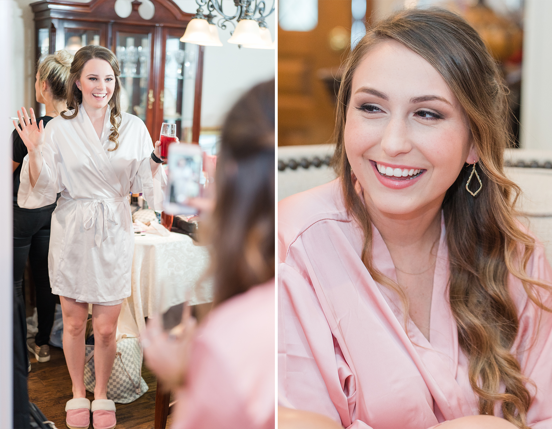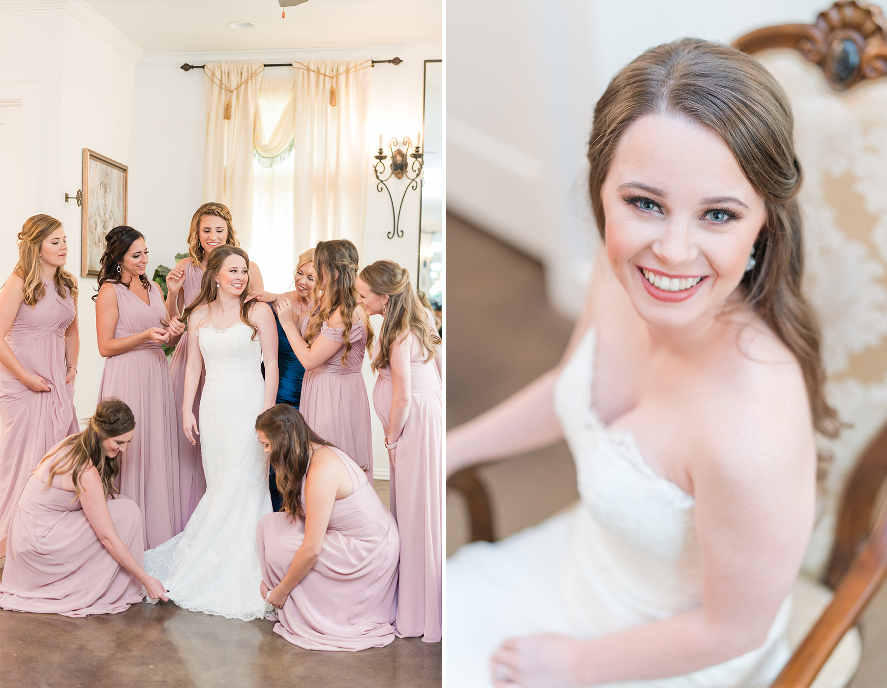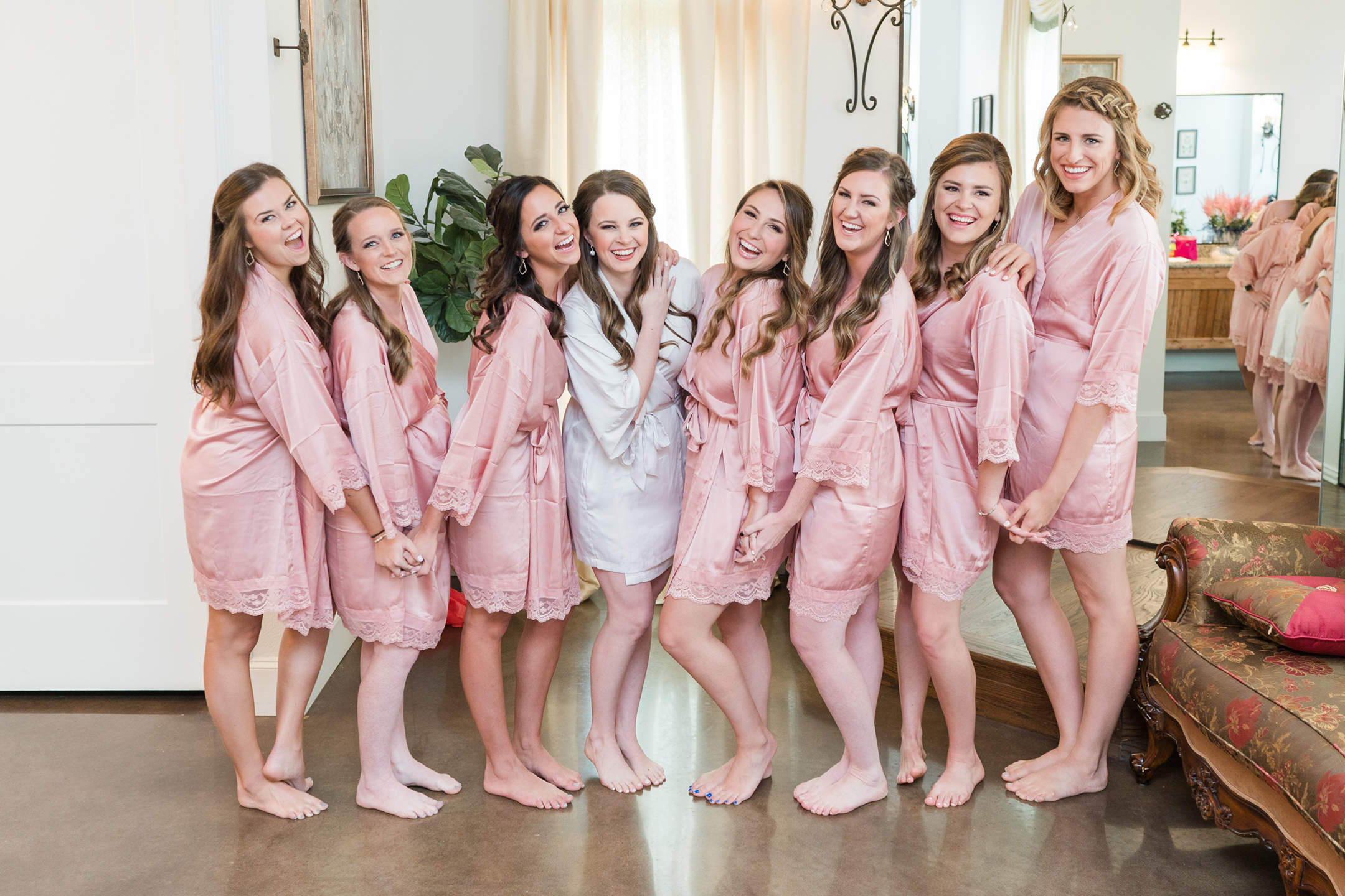 Emily and her Bride Tribe were in full swing of hair and makeup at her parents home in Garland when I arrived. I LOVE it when I walk into a room and I’m greeted with lots of hellos and smiles! You know it’s going to be a fabulous day when you feel like you are one of the girls! And this team of makeup and hair artists was on point! Not only did they do an amazing job, they had a schedule and were right on time!