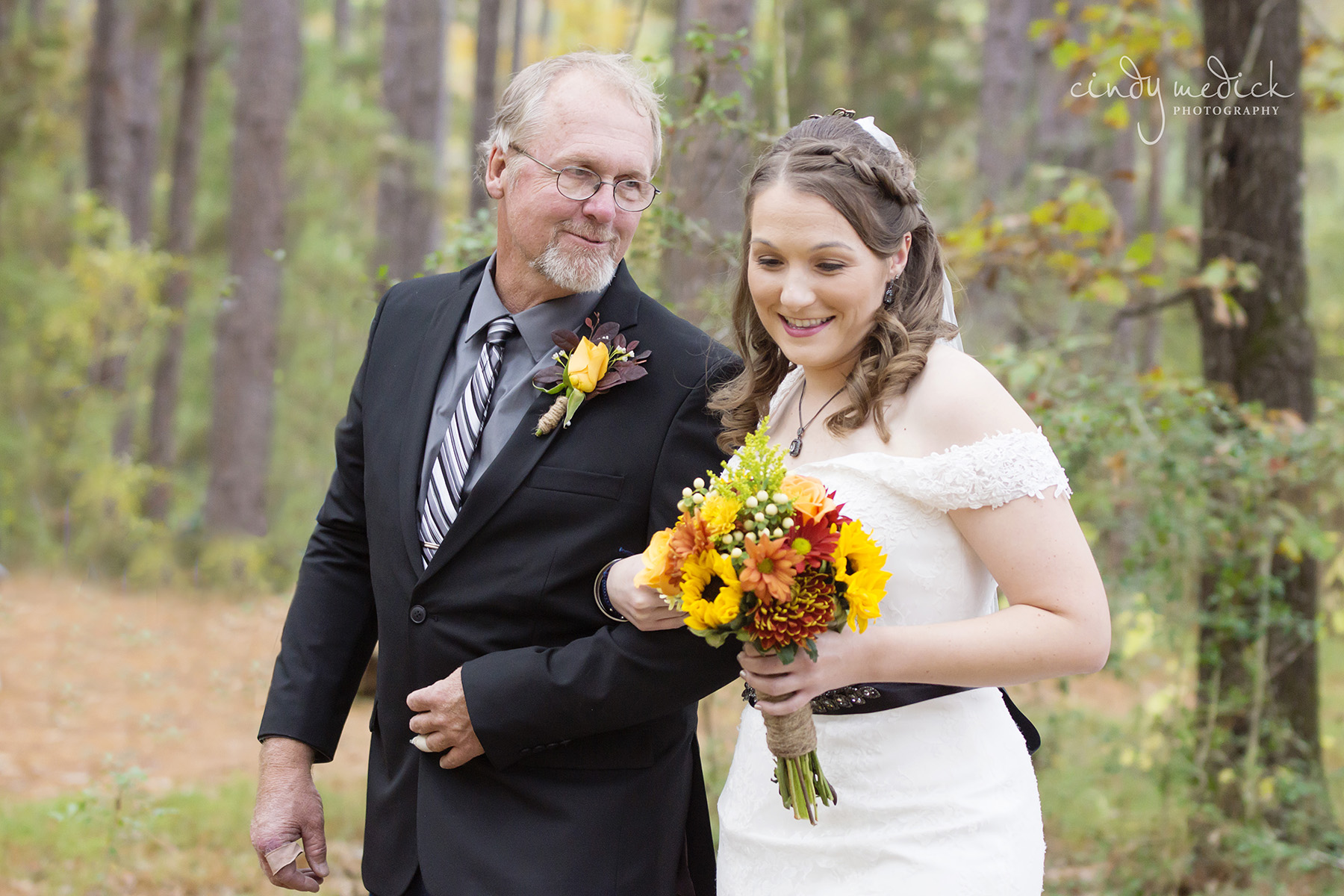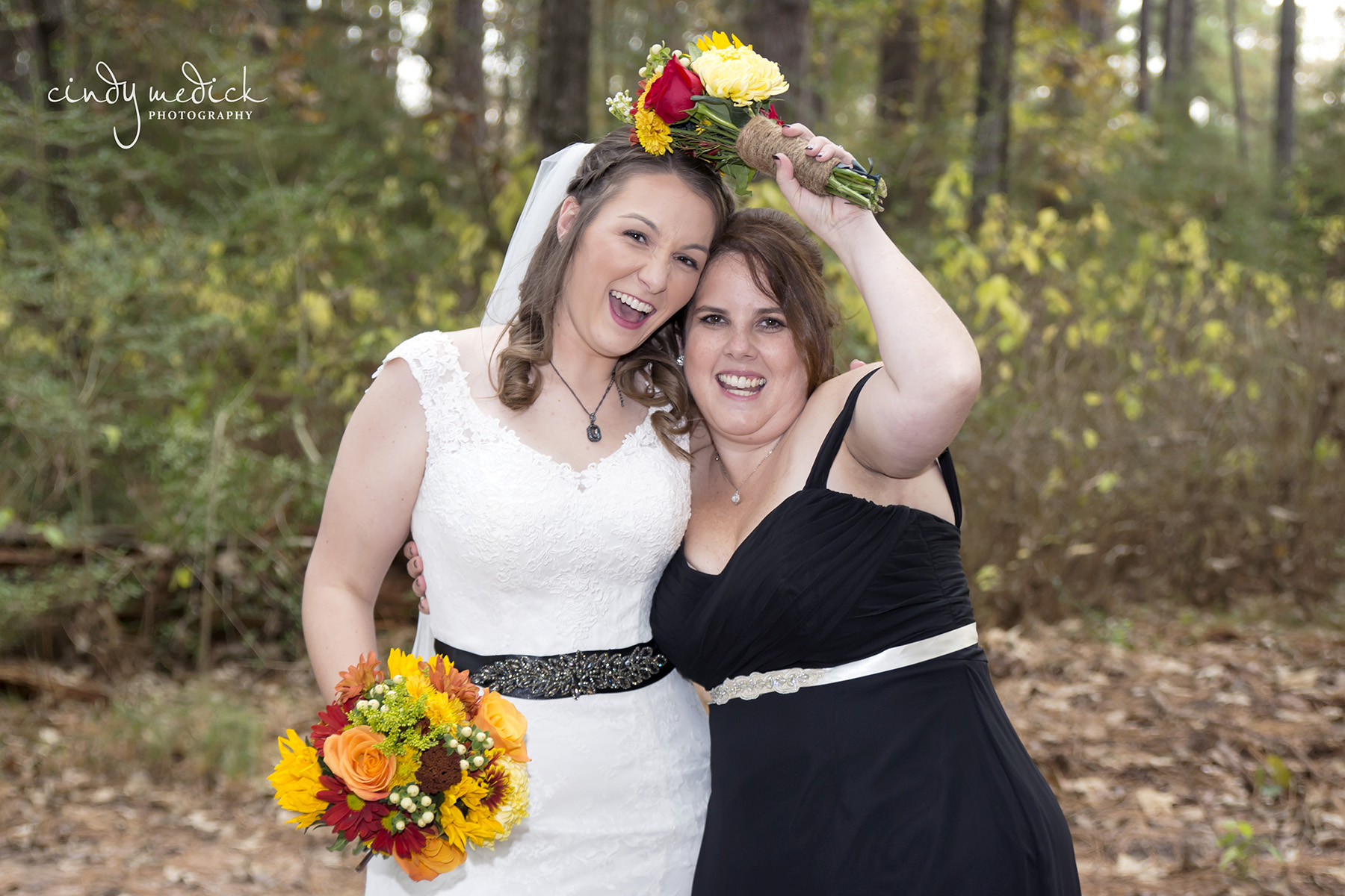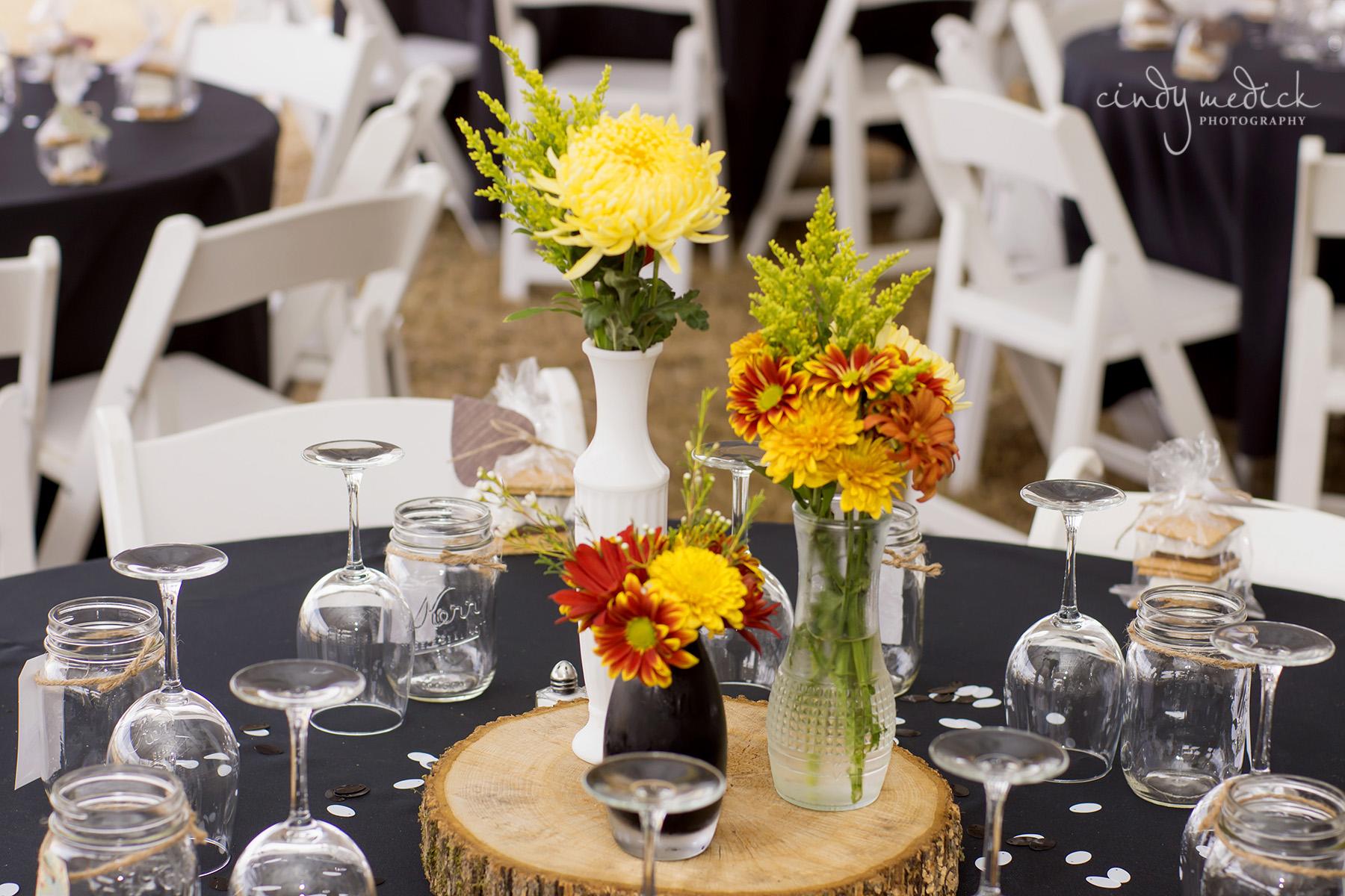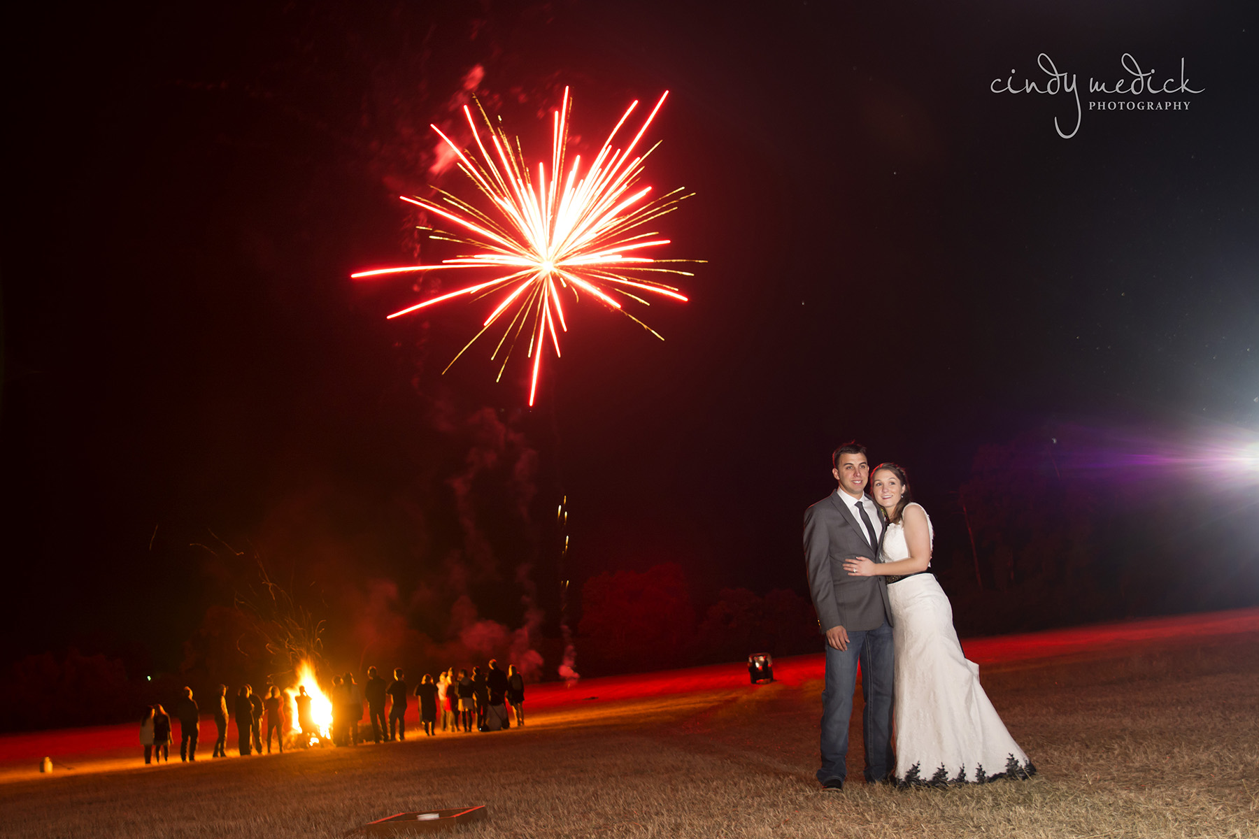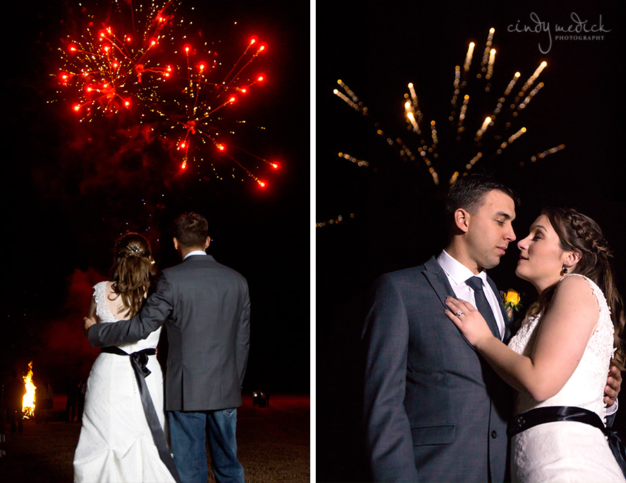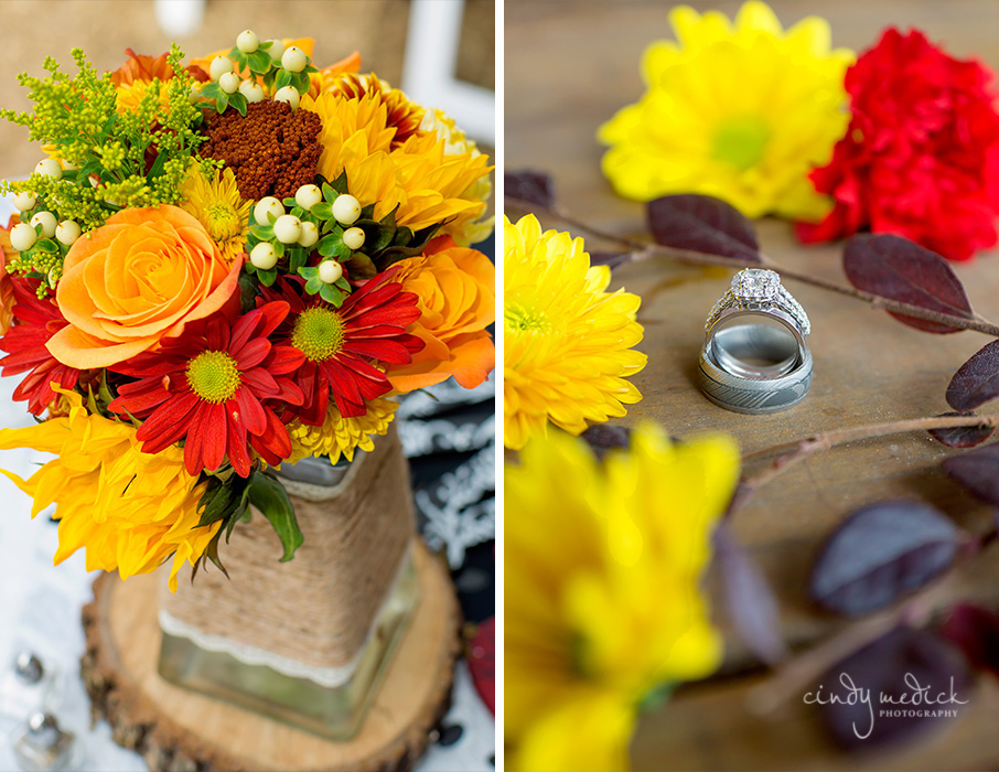 Everything about this rustic wedding, I loved. The flowers, which the bride arranged herself, are gorgeous. They are everything that fall represents with the sunflowers and mix of colors. What a clever idea to have the bouquets as the centerpieces. The cake tree, the ceremony site surrounded by nature, the wrap around porch on the cabin, the twinkle lights illuminating the dance floor, a huge bonfire and romantic fireworks…just so many things to love. Kelli’s mom & dad put a lot of work and love into making this happen for their daughter and not to mention her sister, friends, family, and Kelli and Shane. What an awesome family they have!