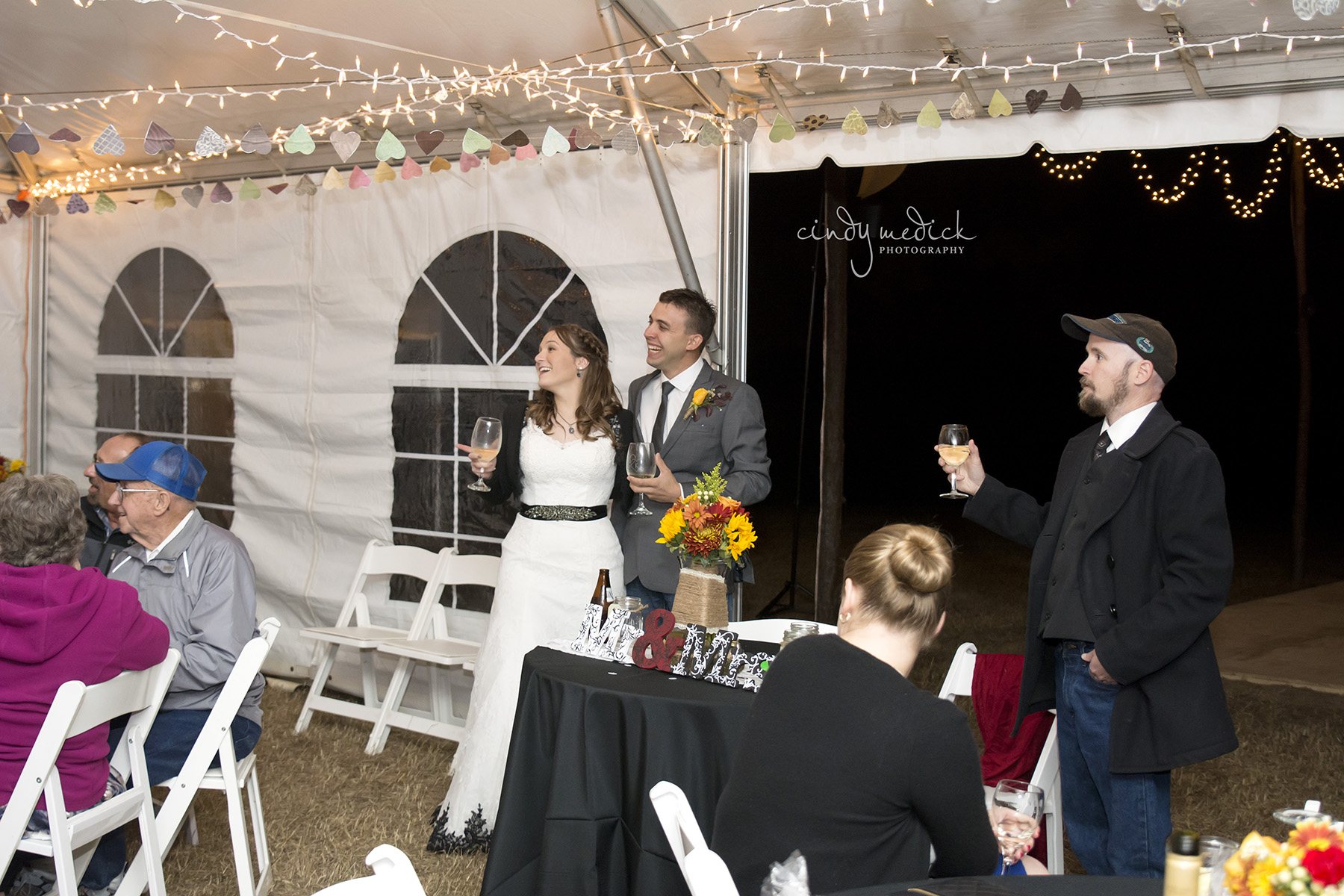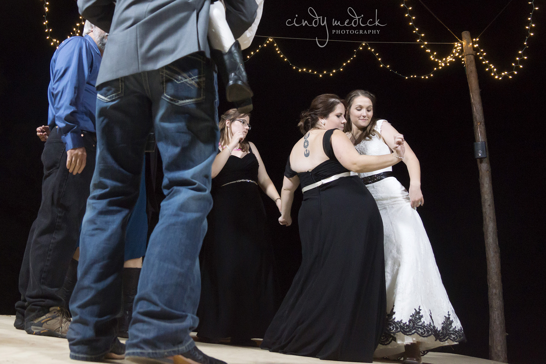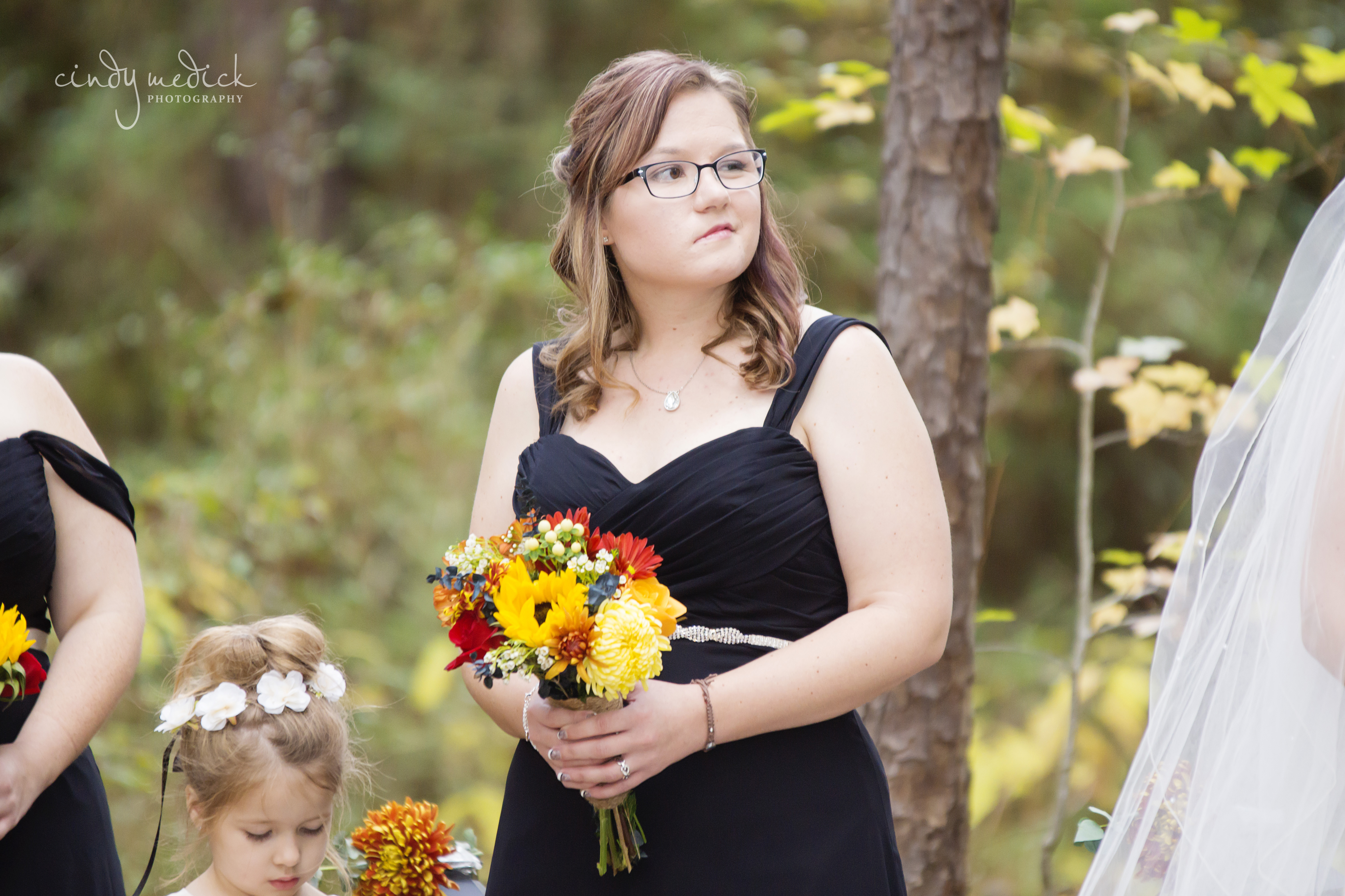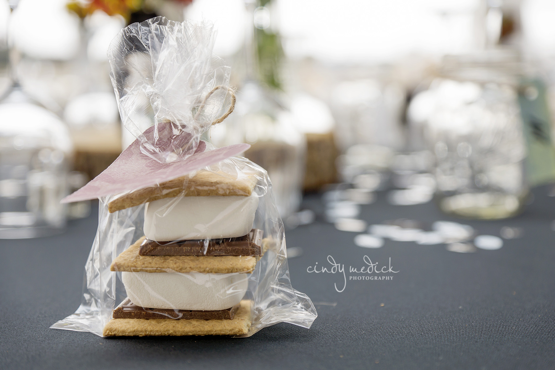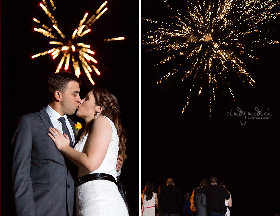Everything about this rustic wedding, I loved. The flowers, which the bride arranged herself, are gorgeous. They are everything that fall represents with the sunflowers and mix of colors. What a clever idea to have the bouquets as the centerpieces. The cake tree, the ceremony site surrounded by nature, the wrap around porch on the cabin, the twinkle lights illuminating the dance floor, a huge bonfire and romantic fireworks…just so many things to love. Kelli’s mom & dad put a lot of work and love into making this happen for their daughter and not to mention her sister, friends, family, and Kelli and Shane. What an awesome family they have!