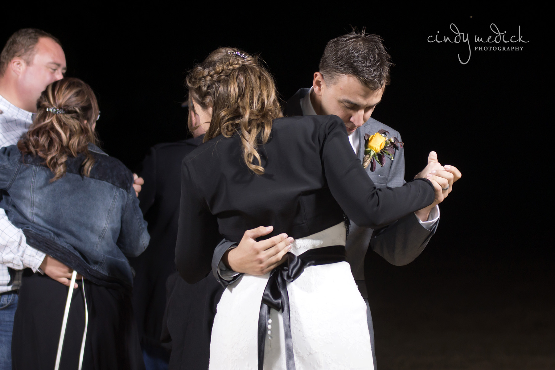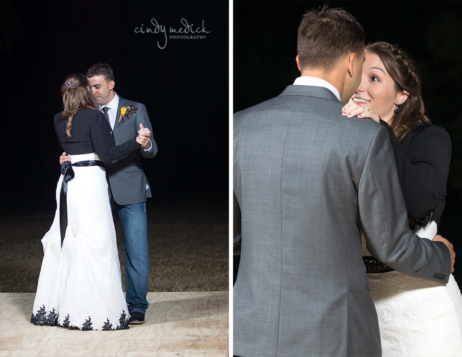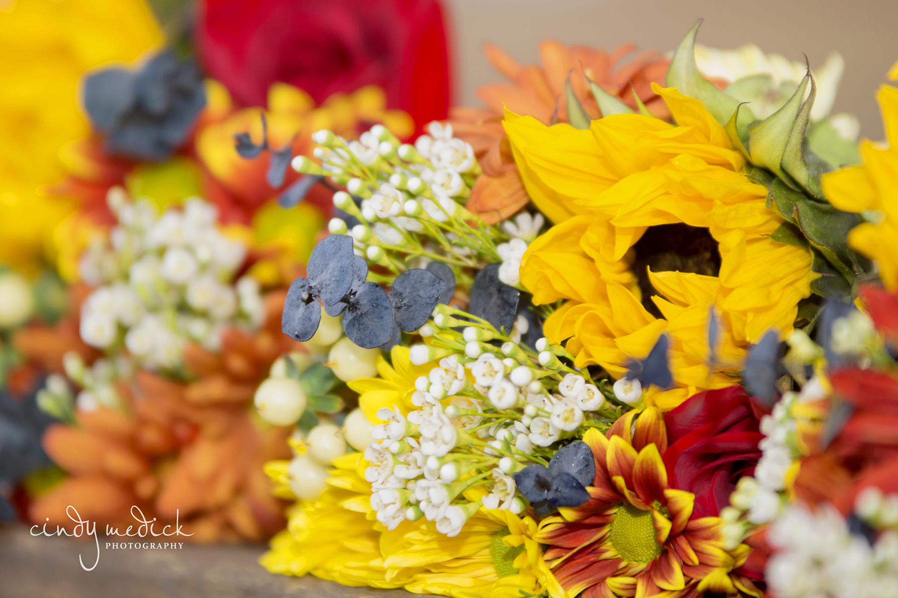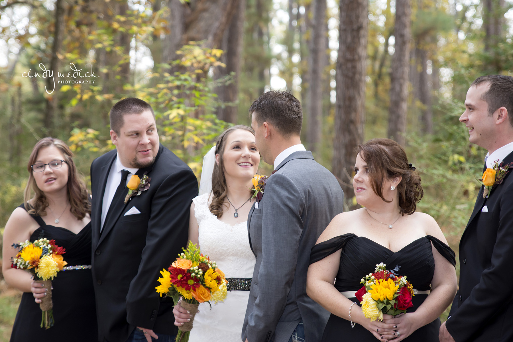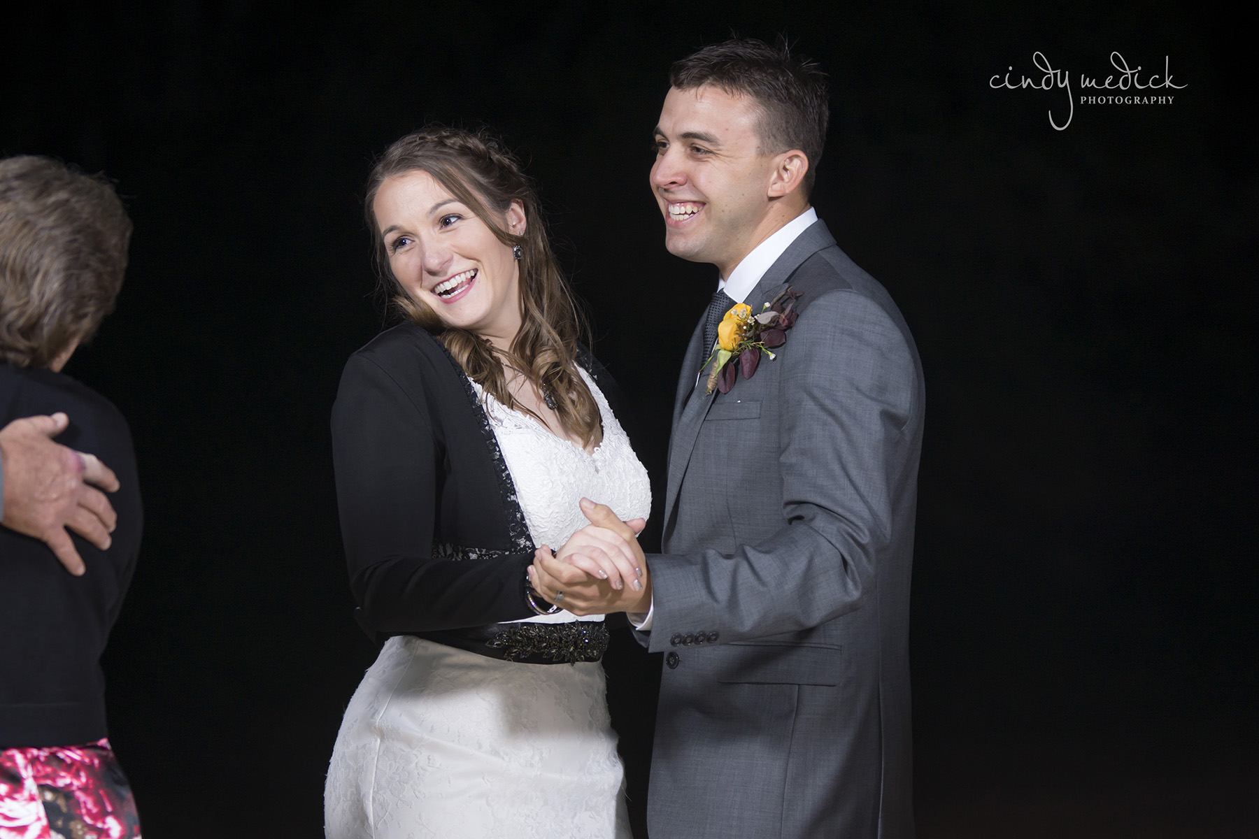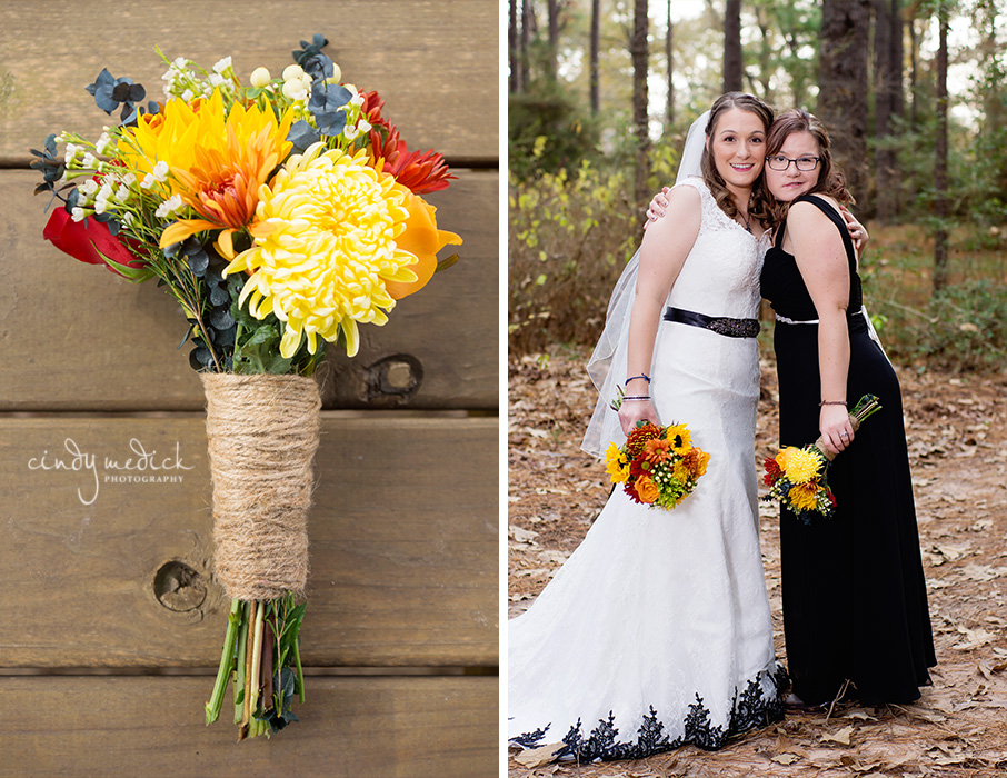 Everything about this rustic wedding, I loved. The flowers, which the bride arranged herself, are gorgeous. They are everything that fall represents with the sunflowers and mix of colors. What a clever idea to have the bouquets as the centerpieces. The cake tree, the ceremony site surrounded by nature, the wrap around porch on the cabin, the twinkle lights illuminating the dance floor, a huge bonfire and romantic fireworks…just so many things to love. Kelli’s mom & dad put a lot of work and love into making this happen for their daughter and not to mention her sister, friends, family, and Kelli and Shane. What an awesome family they have!