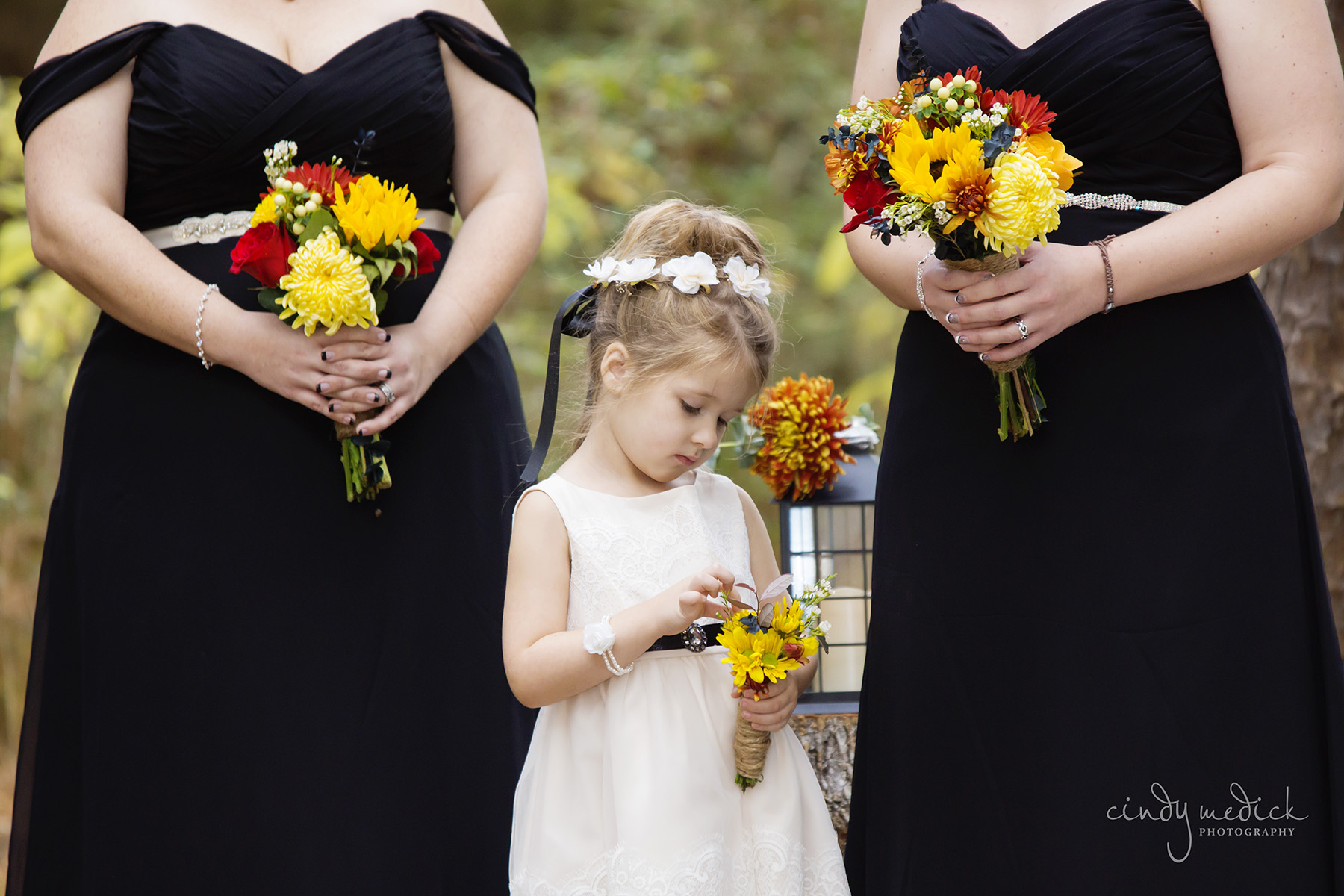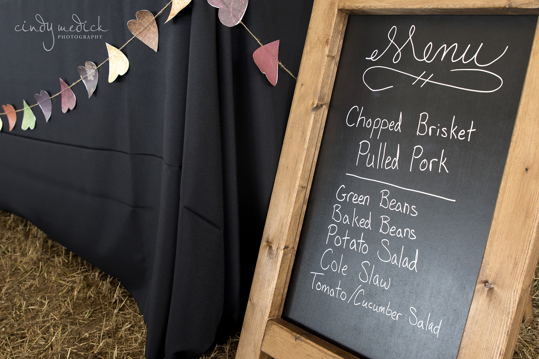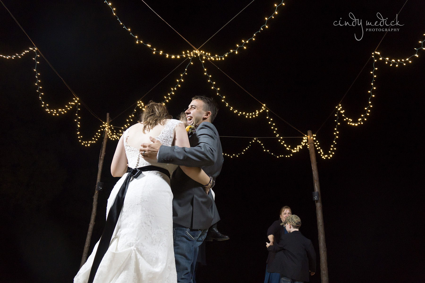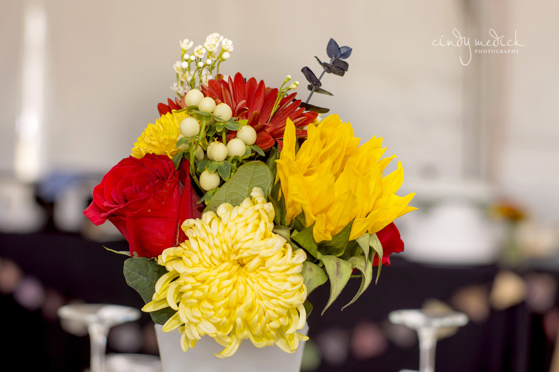 Everything about this rustic wedding, I loved. The flowers, which the bride arranged herself, are gorgeous. They are everything that fall represents with the sunflowers and mix of colors. What a clever idea to have the bouquets as the centerpieces. The cake tree, the ceremony site surrounded by nature, the wrap around porch on the cabin, the twinkle lights illuminating the dance floor, a huge bonfire and romantic fireworks…just so many things to love. Kelli’s mom & dad put a lot of work and love into making this happen for their daughter and not to mention her sister, friends, family, and Kelli and Shane. What an awesome family they have!