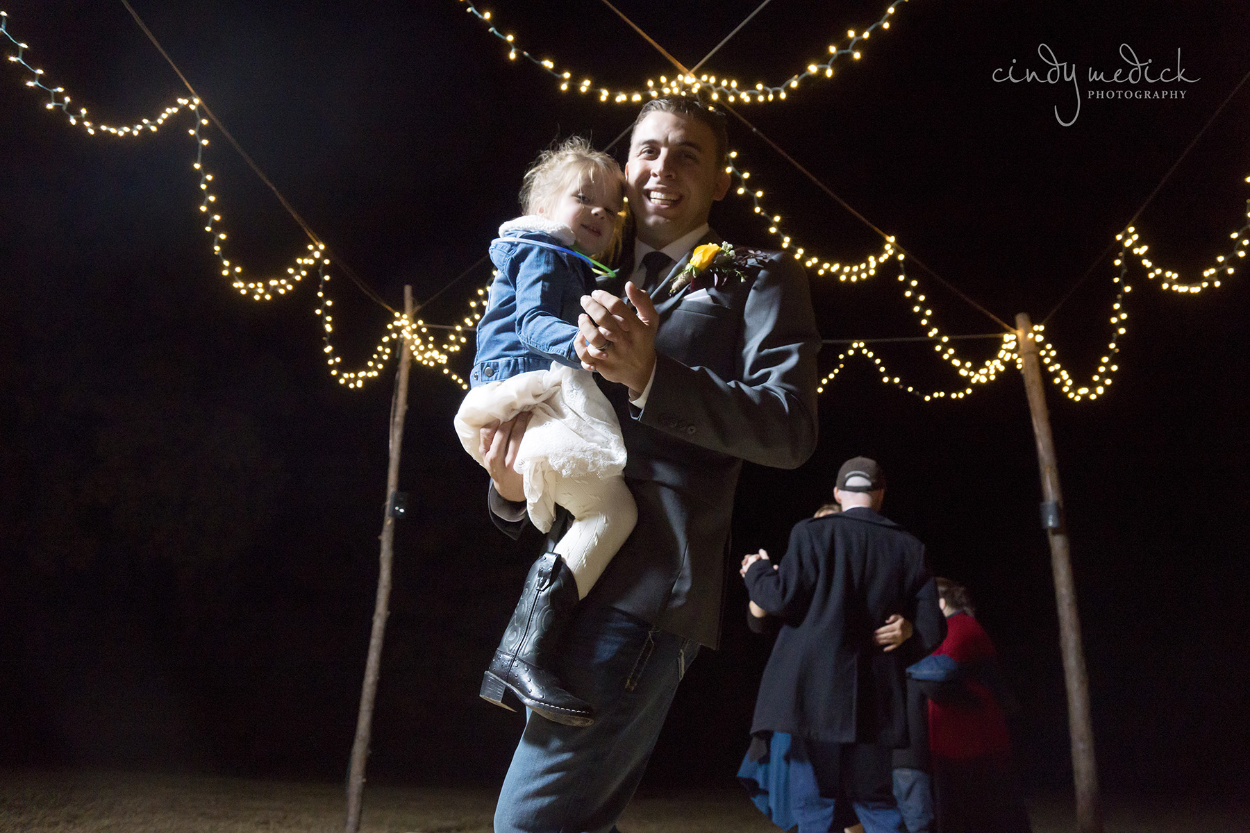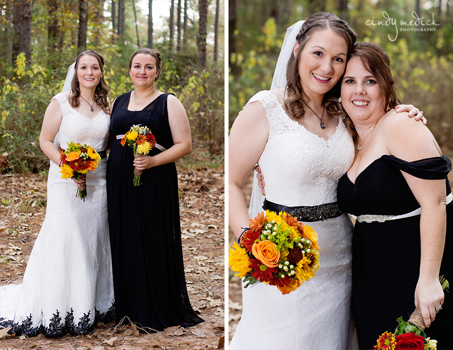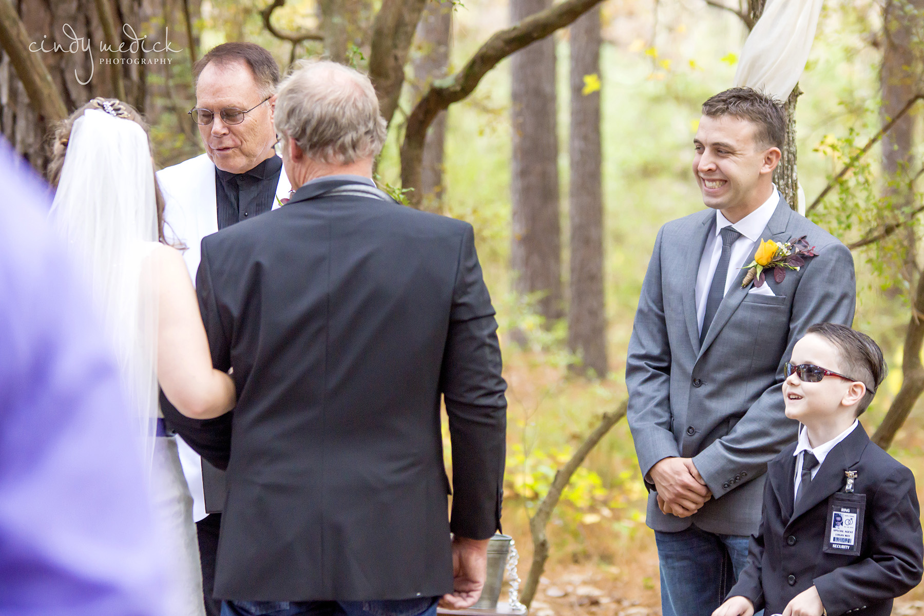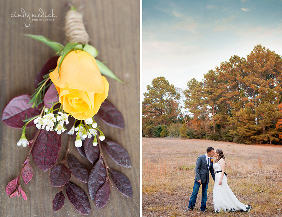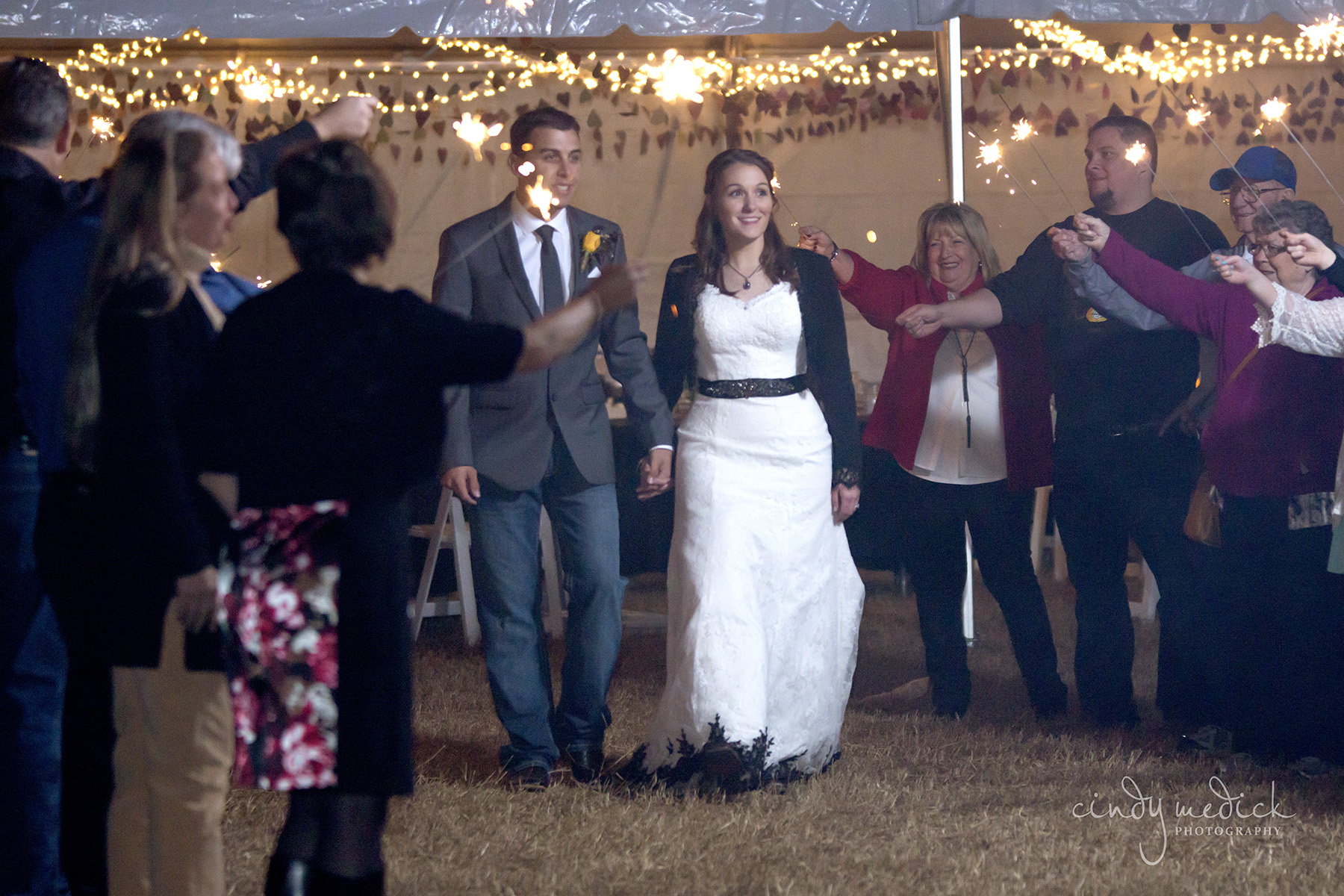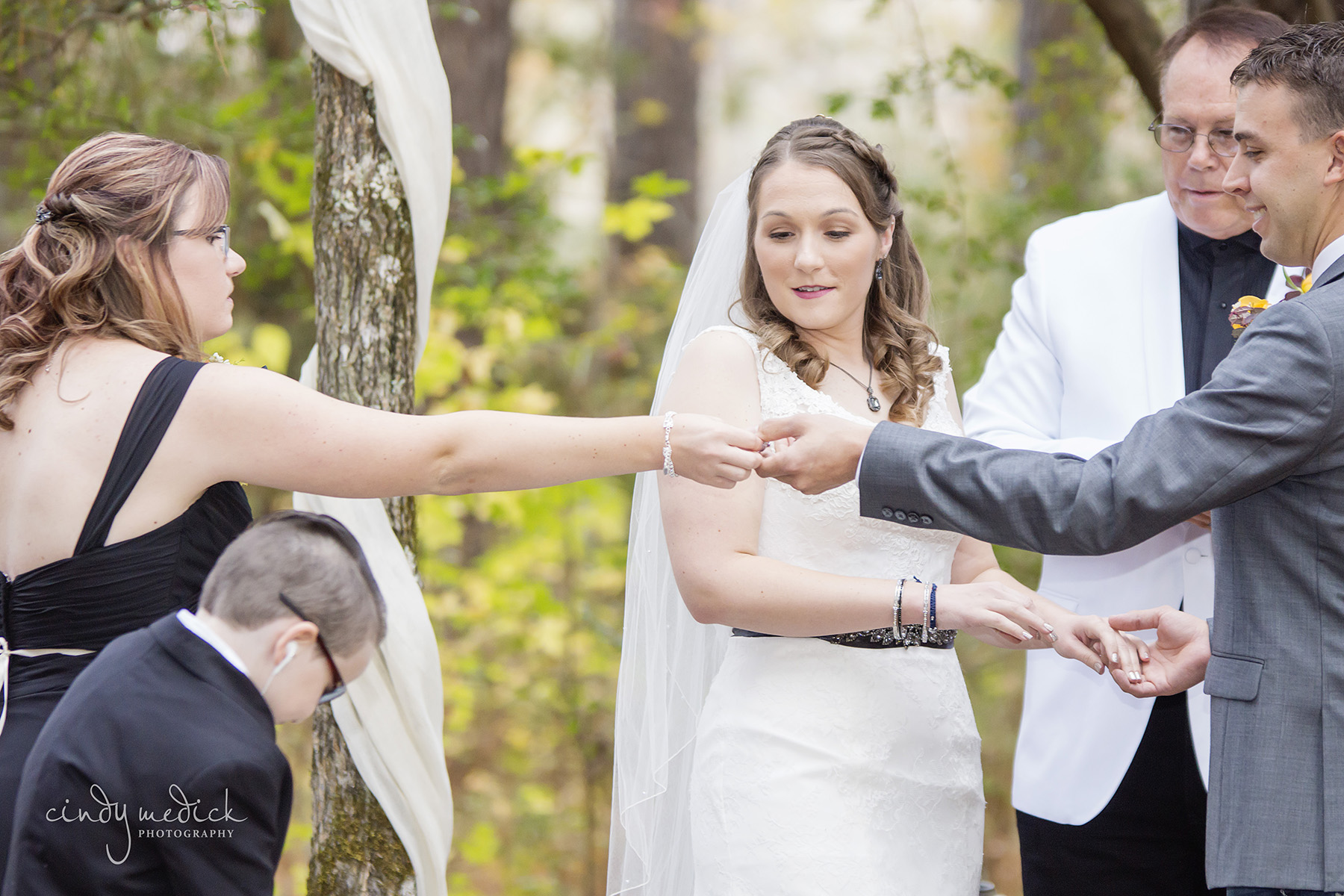 Everything about this rustic wedding, I loved. The flowers, which the bride arranged herself, are gorgeous. They are everything that fall represents with the sunflowers and mix of colors. What a clever idea to have the bouquets as the centerpieces. The cake tree, the ceremony site surrounded by nature, the wrap around porch on the cabin, the twinkle lights illuminating the dance floor, a huge bonfire and romantic fireworks…just so many things to love. Kelli’s mom & dad put a lot of work and love into making this happen for their daughter and not to mention her sister, friends, family, and Kelli and Shane. What an awesome family they have!