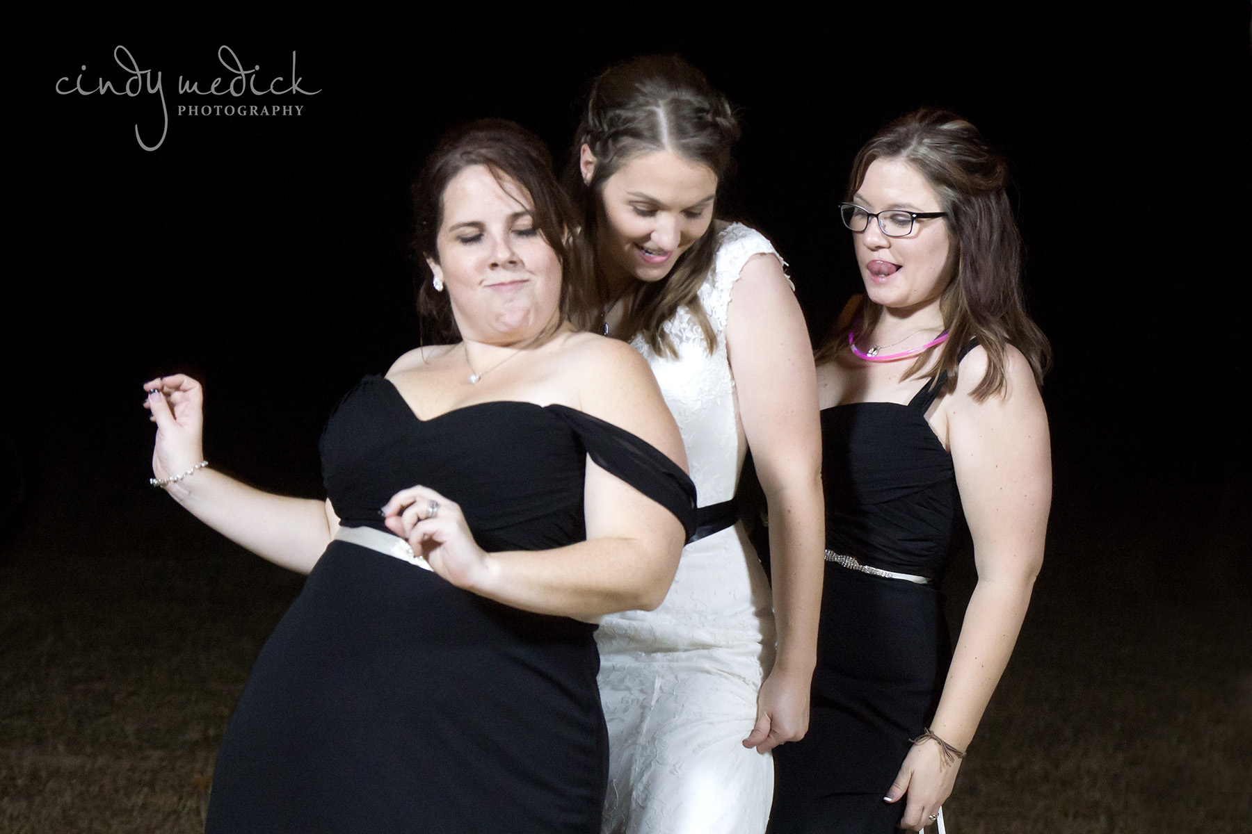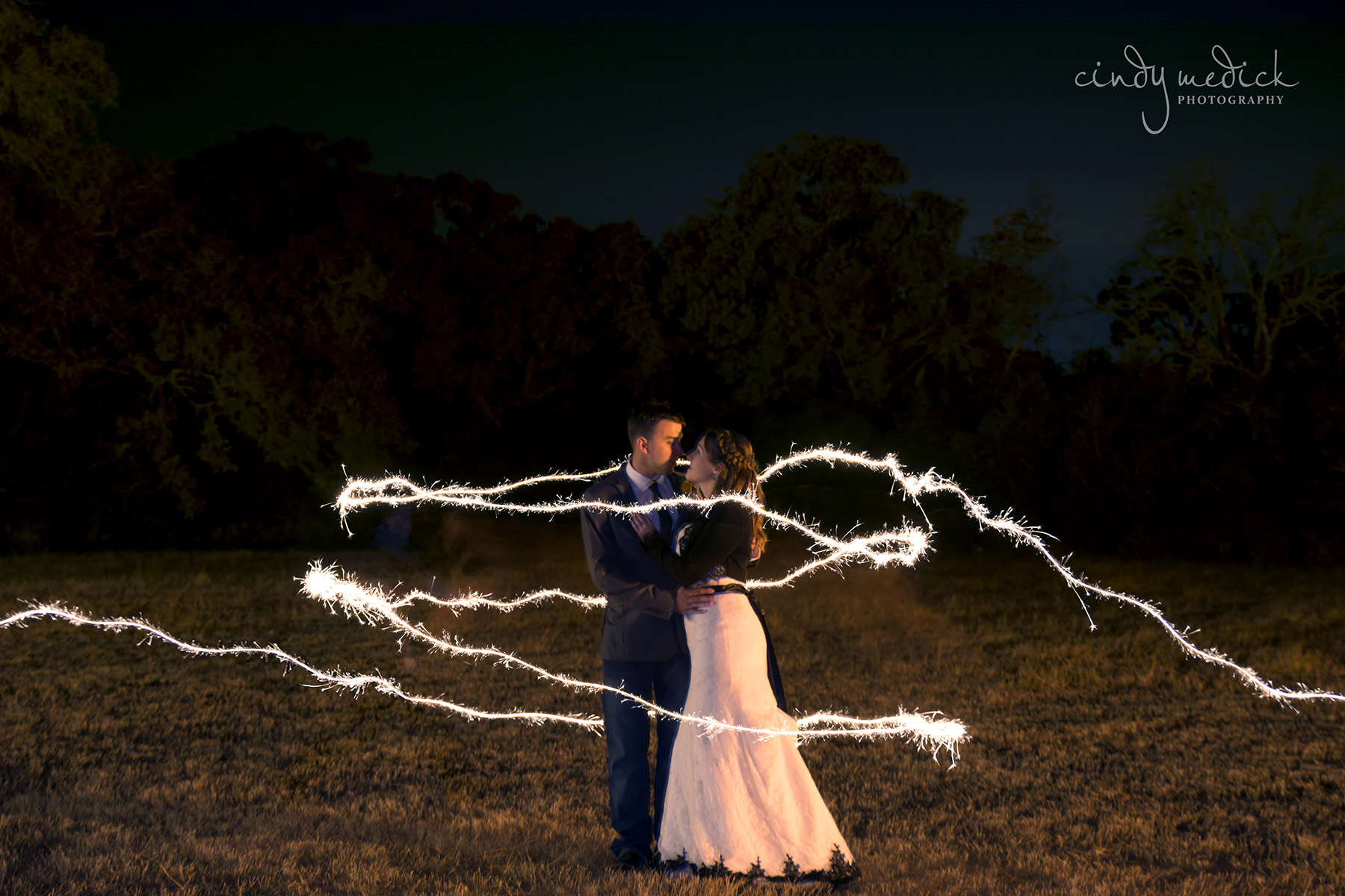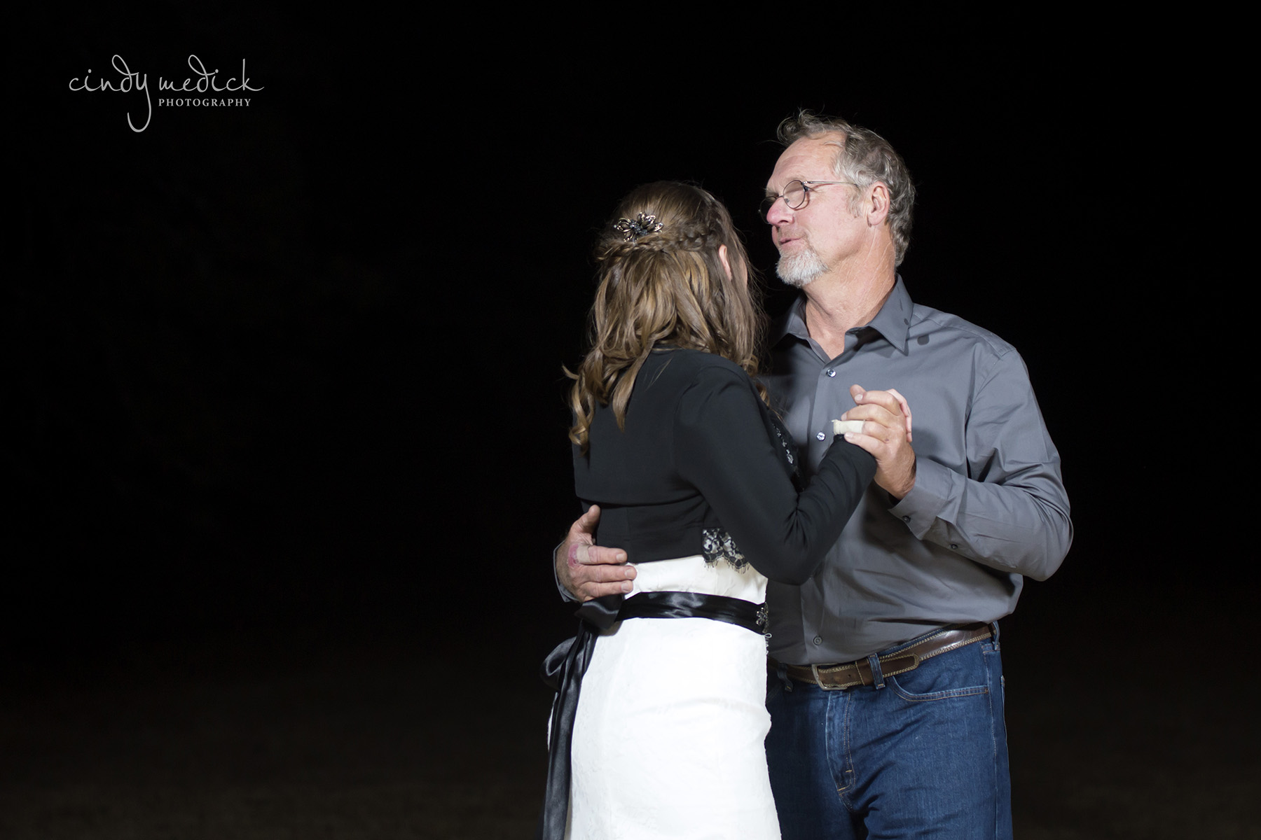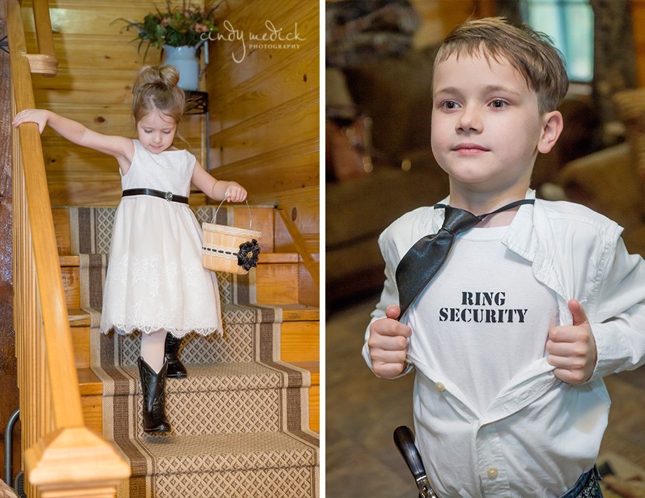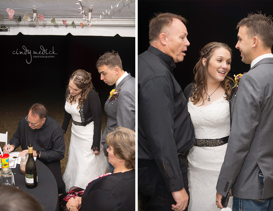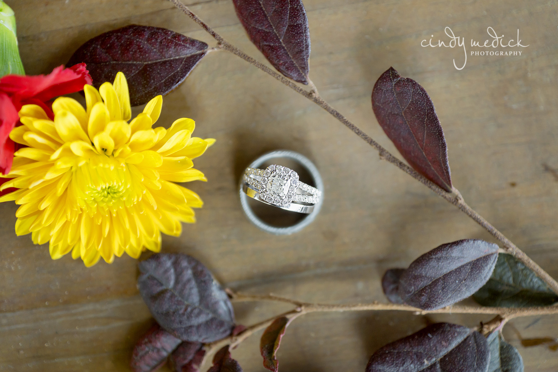 Everything about this rustic wedding, I loved. The flowers, which the bride arranged herself, are gorgeous. They are everything that fall represents with the sunflowers and mix of colors. What a clever idea to have the bouquets as the centerpieces. The cake tree, the ceremony site surrounded by nature, the wrap around porch on the cabin, the twinkle lights illuminating the dance floor, a huge bonfire and romantic fireworks…just so many things to love. Kelli’s mom & dad put a lot of work and love into making this happen for their daughter and not to mention her sister, friends, family, and Kelli and Shane. What an awesome family they have!