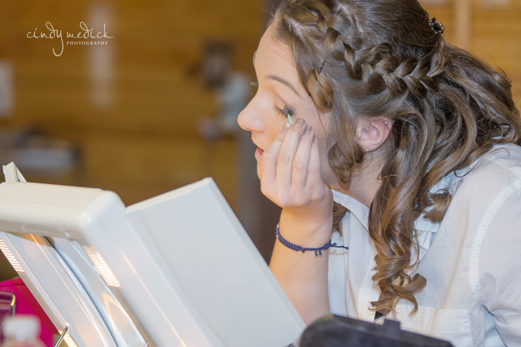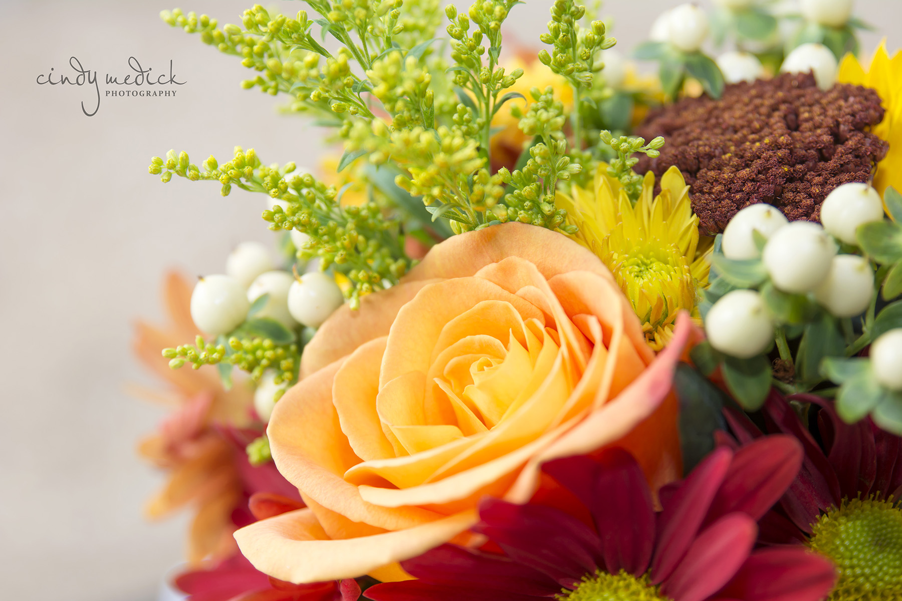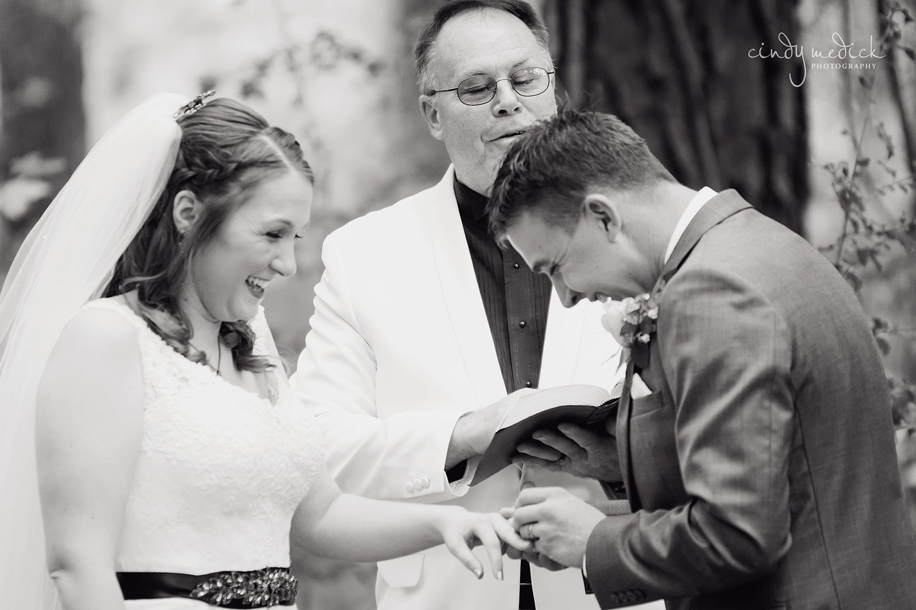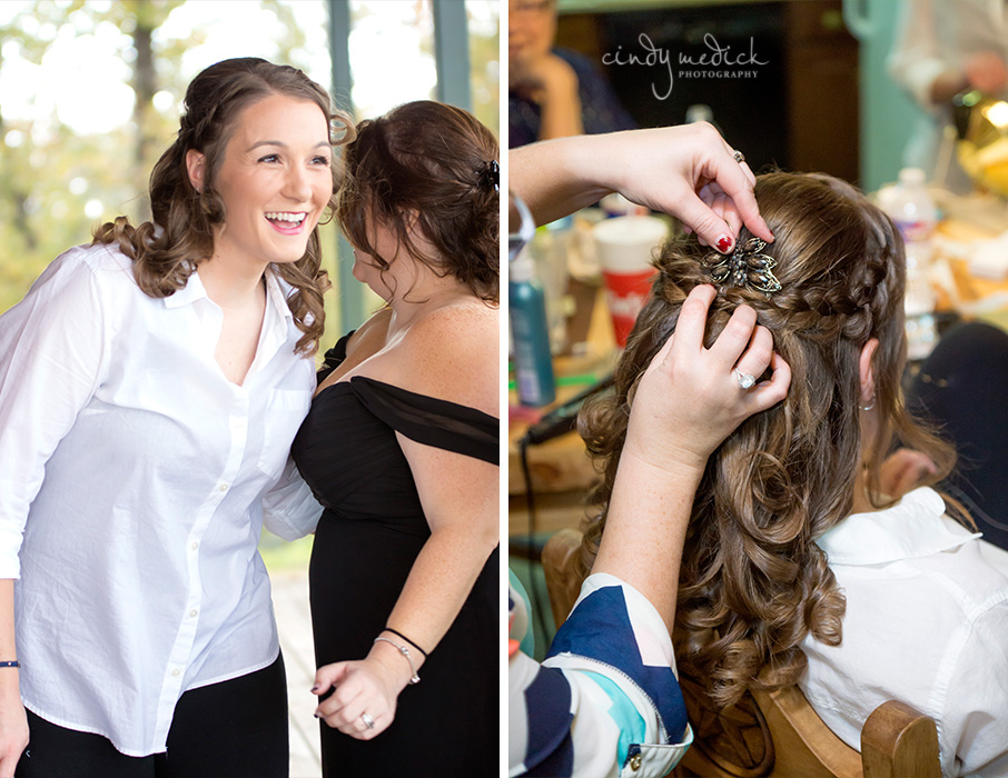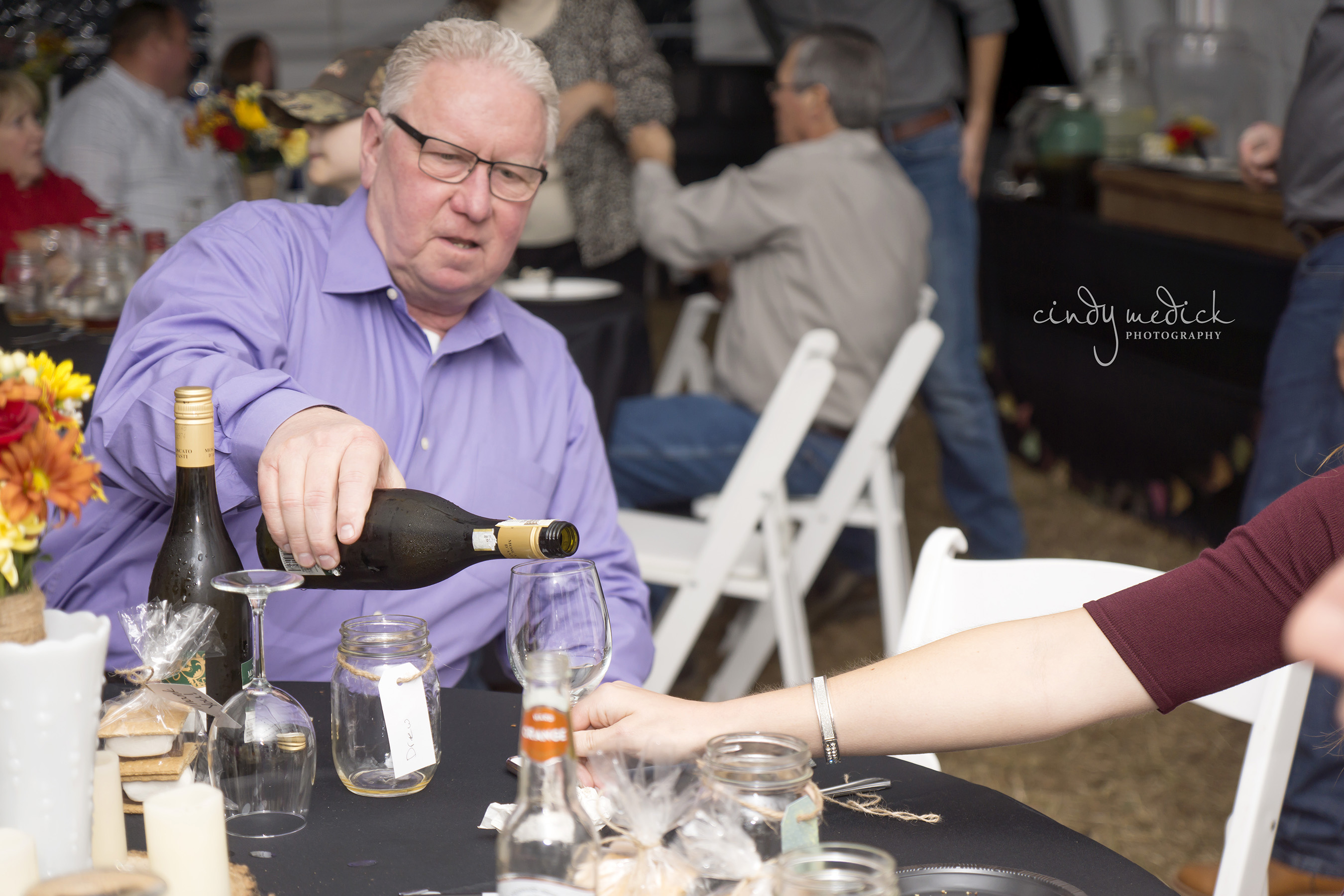 Everything about this rustic wedding, I loved. The flowers, which the bride arranged herself, are gorgeous. They are everything that fall represents with the sunflowers and mix of colors. What a clever idea to have the bouquets as the centerpieces. The cake tree, the ceremony site surrounded by nature, the wrap around porch on the cabin, the twinkle lights illuminating the dance floor, a huge bonfire and romantic fireworks…just so many things to love. Kelli’s mom & dad put a lot of work and love into making this happen for their daughter and not to mention her sister, friends, family, and Kelli and Shane. What an awesome family they have!
