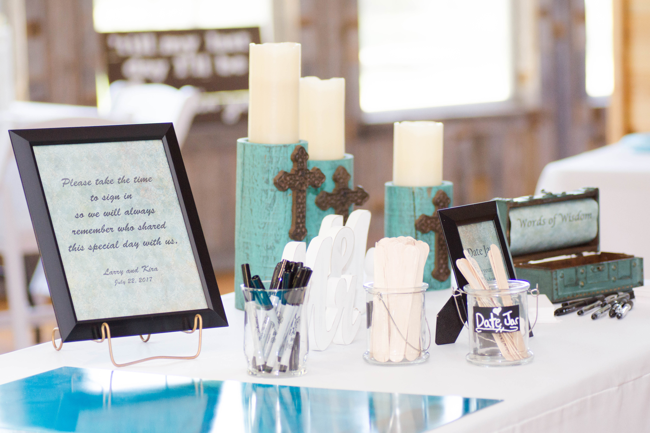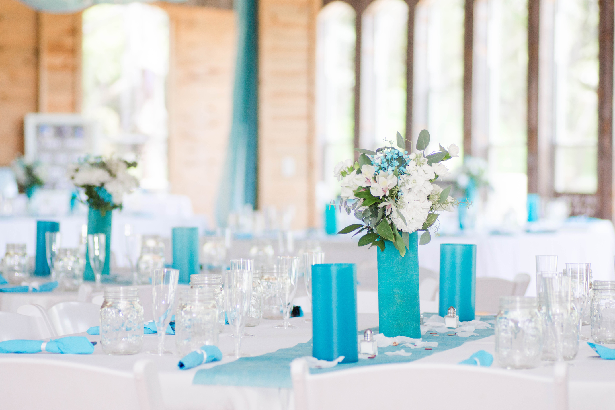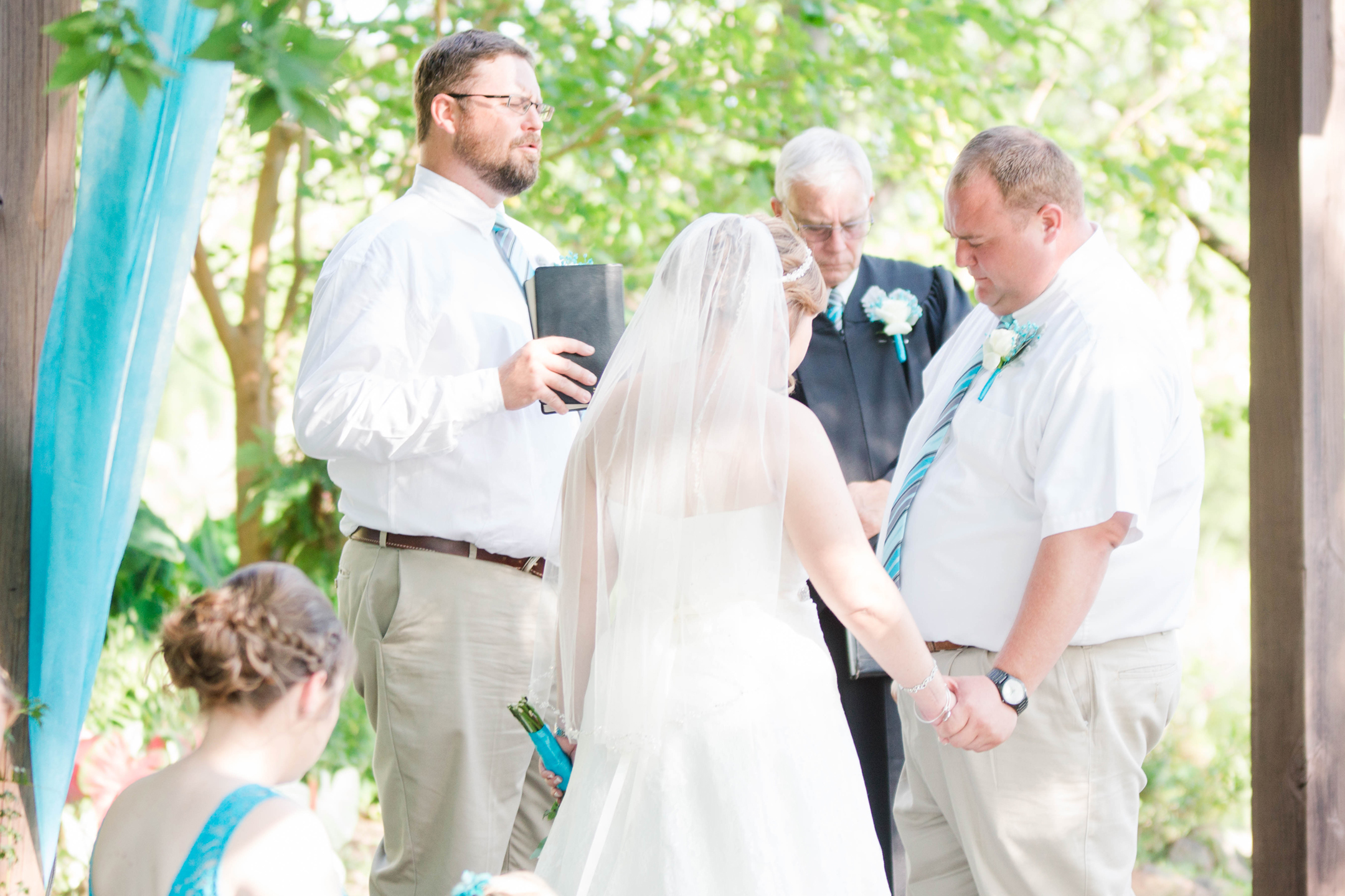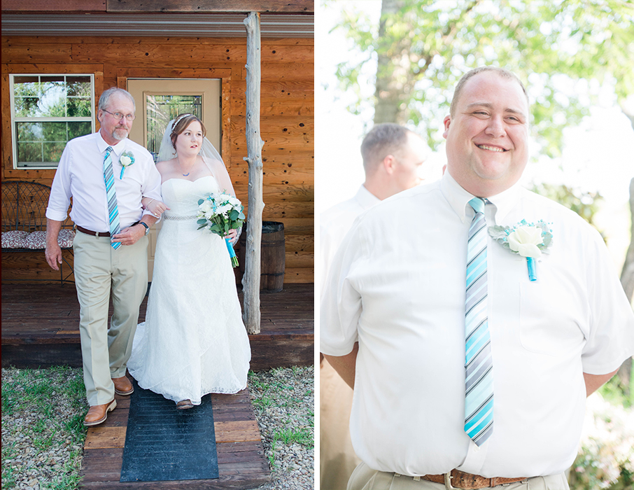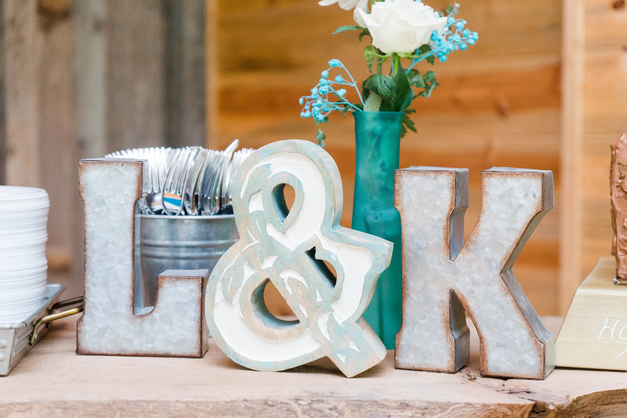 When we arrived, everyone was putting the final touches to the cabin where the reception was being held. The centerpieces doubled as the bridal and bridesmaids bouquets. Each place setting had a mason jar and champagne glasses for the toasts. The table runners, candle holders, drapes, and vases filled the room with turquoise giving this reception such a bright and airy feel. My fav! A projector was running pictures of the bride and groom from when they were babies to the present. Everything was just wonderful! The ceremony location, which is right next to the cabin, was lined with white chairs and wooden signs with 1 Corinthians 13:4-7 all along each row. Kira said it was a team effort to make each sign. Larry made the wood plaques and she painted the words on. So sweet! I imagine these will hold a place somewhere in the home they will share. Overlooking the alter, the trees providing the shade move with the breeze and create a sparkle when the sun shines through. Feels magical!