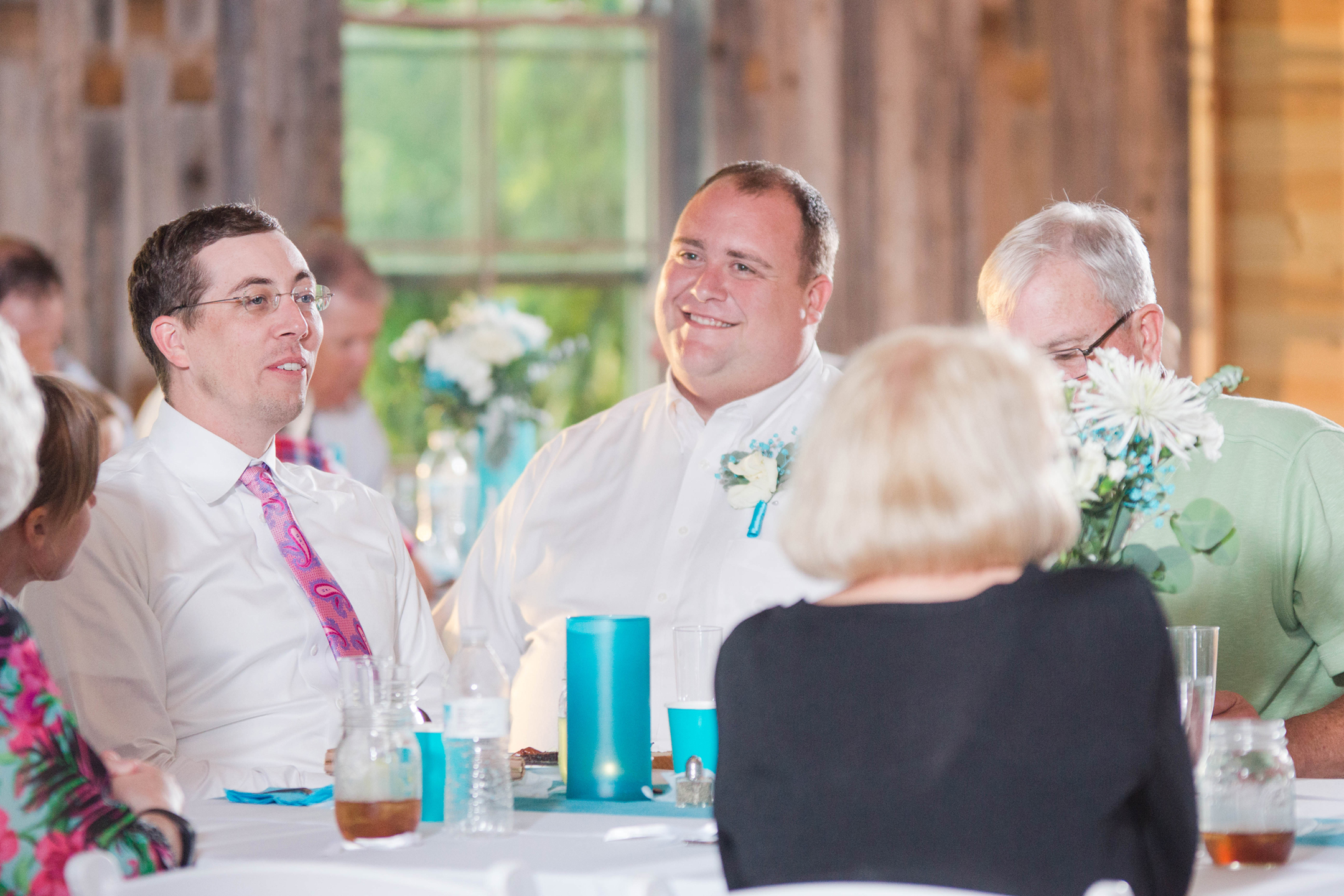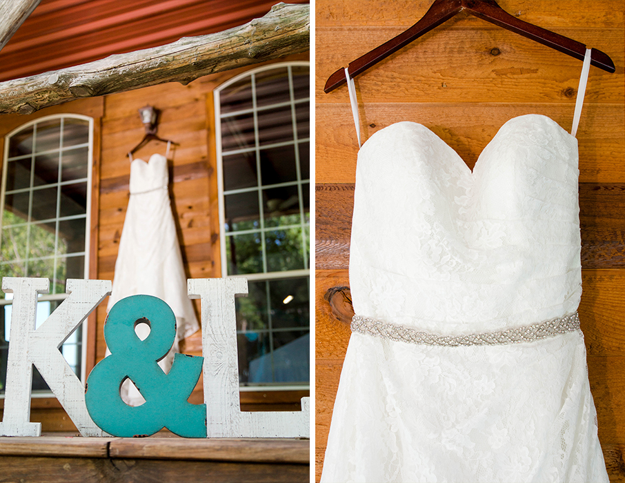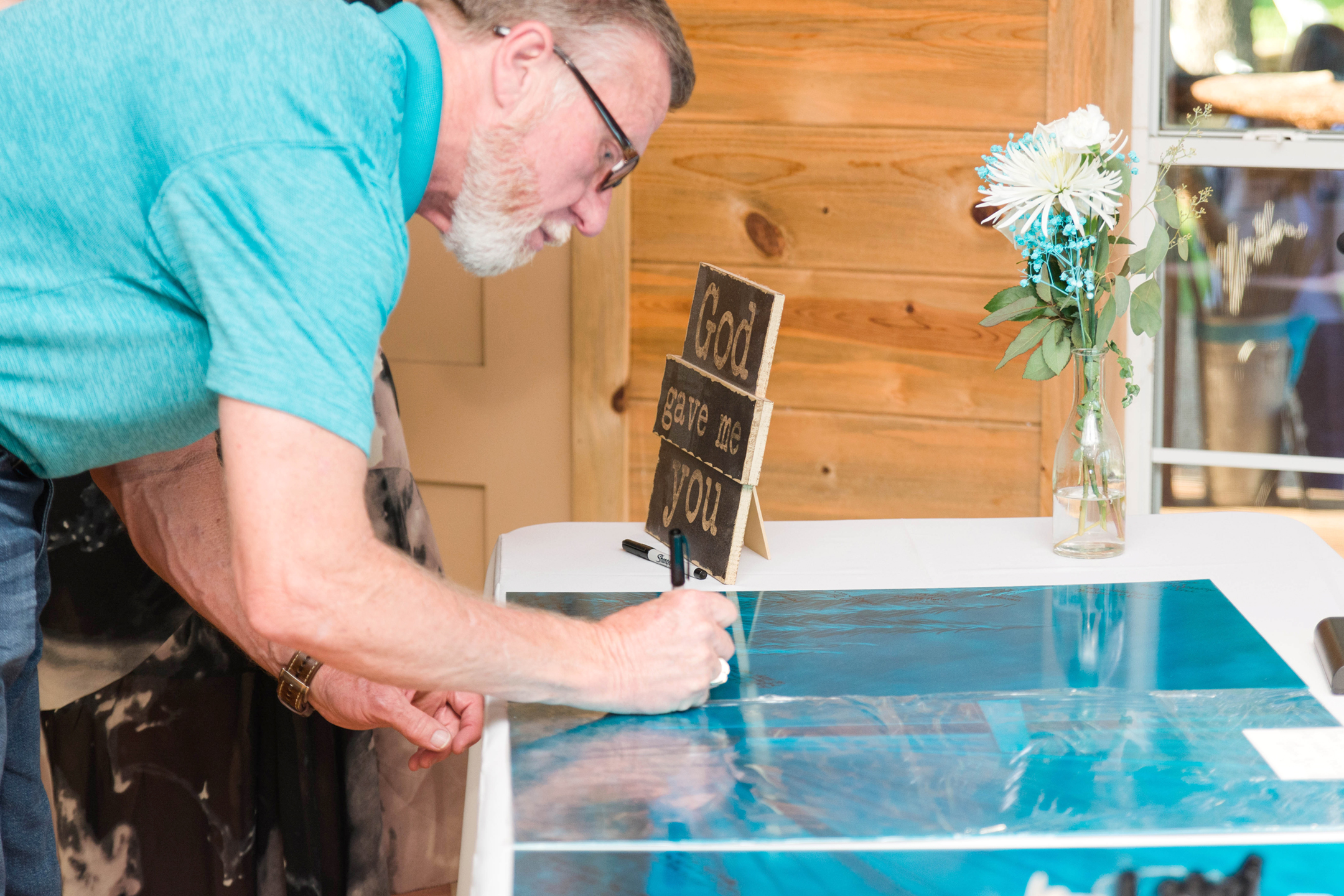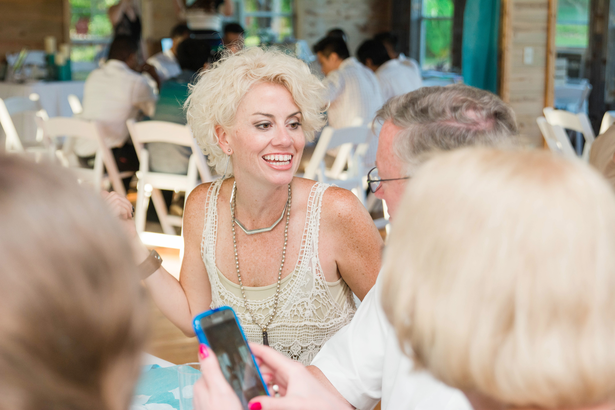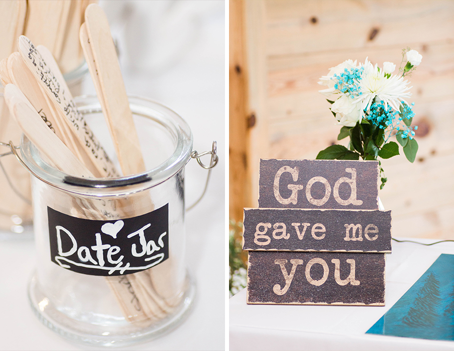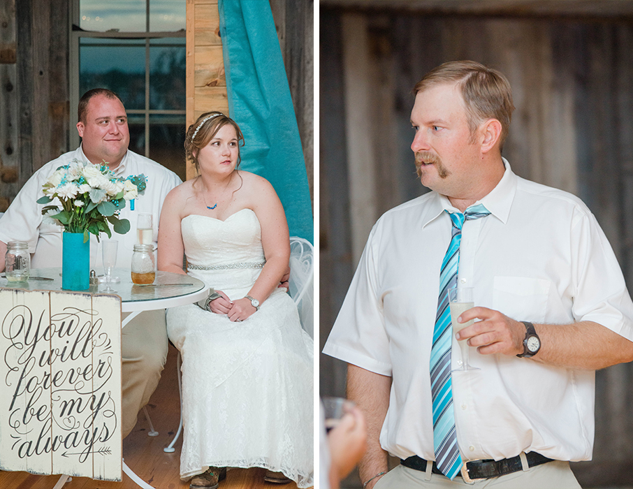 When we arrived, everyone was putting the final touches to the cabin where the reception was being held. The centerpieces doubled as the bridal and bridesmaids bouquets. Each place setting had a mason jar and champagne glasses for the toasts. The table runners, candle holders, drapes, and vases filled the room with turquoise giving this reception such a bright and airy feel. My fav! A projector was running pictures of the bride and groom from when they were babies to the present. Everything was just wonderful! The ceremony location, which is right next to the cabin, was lined with white chairs and wooden signs with 1 Corinthians 13:4-7 all along each row. Kira said it was a team effort to make each sign. Larry made the wood plaques and she painted the words on. So sweet! I imagine these will hold a place somewhere in the home they will share. Overlooking the alter, the trees providing the shade move with the breeze and create a sparkle when the sun shines through. Feels magical!