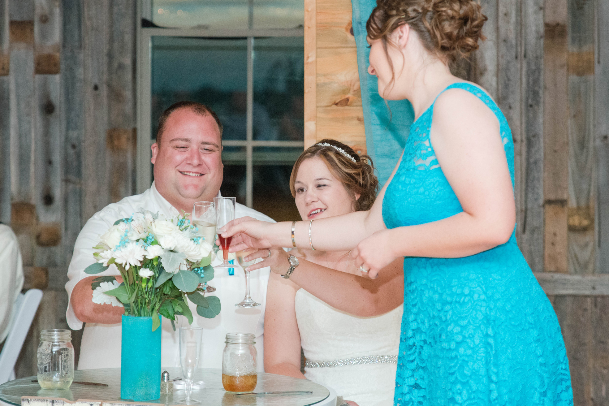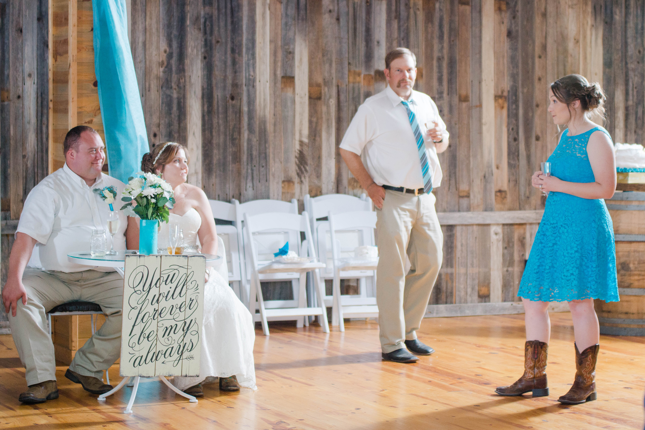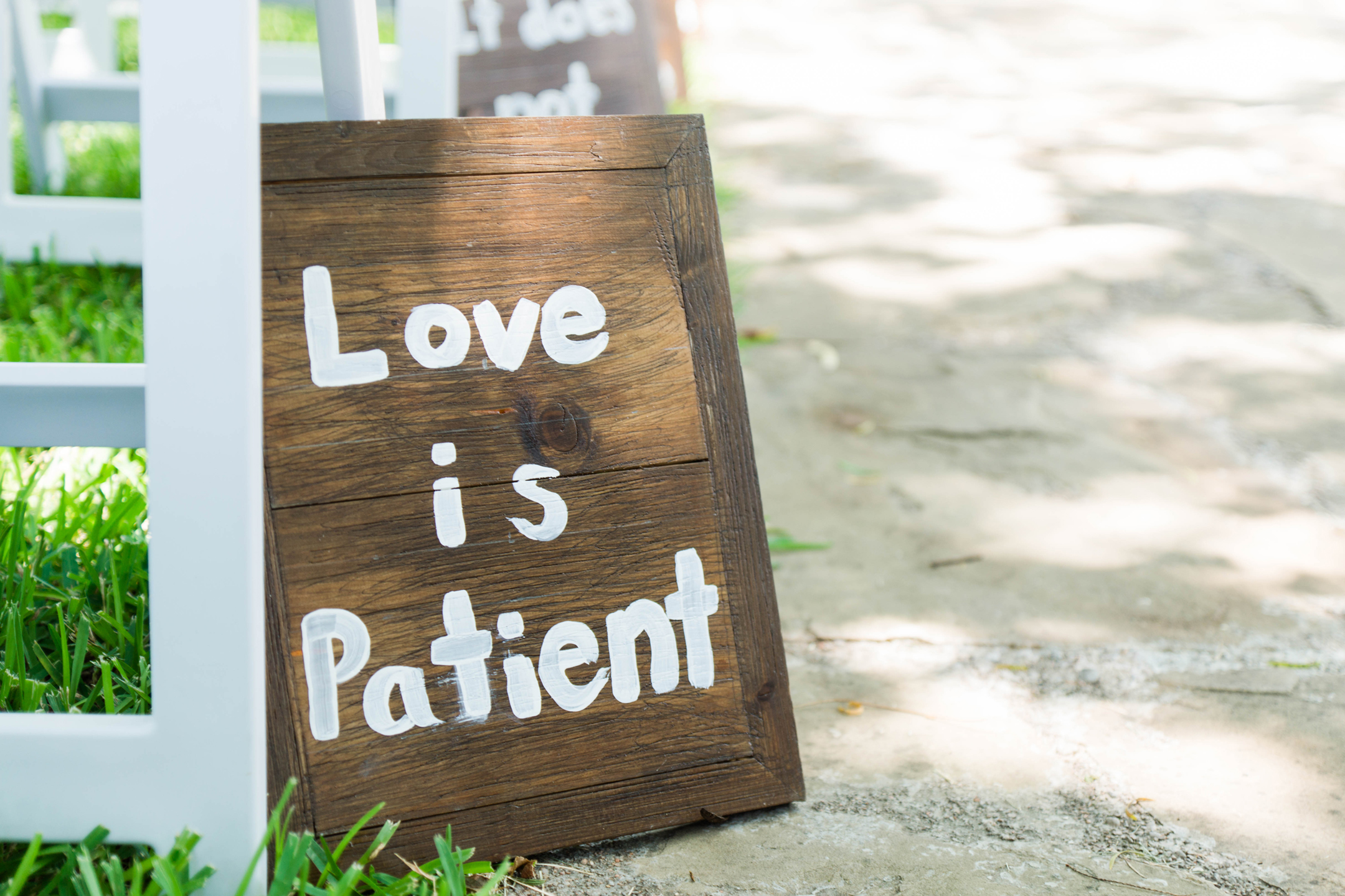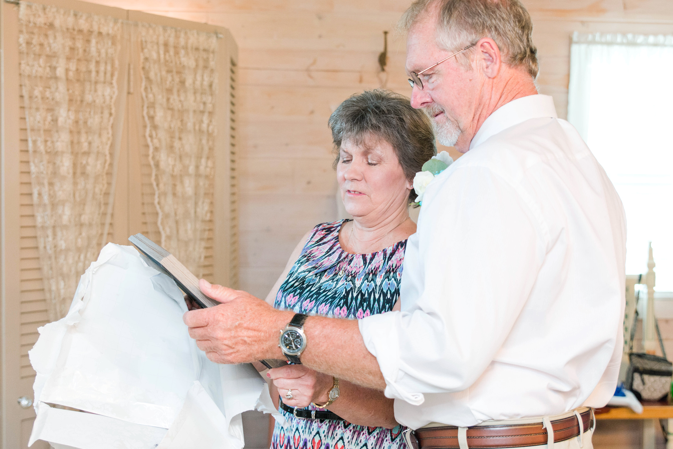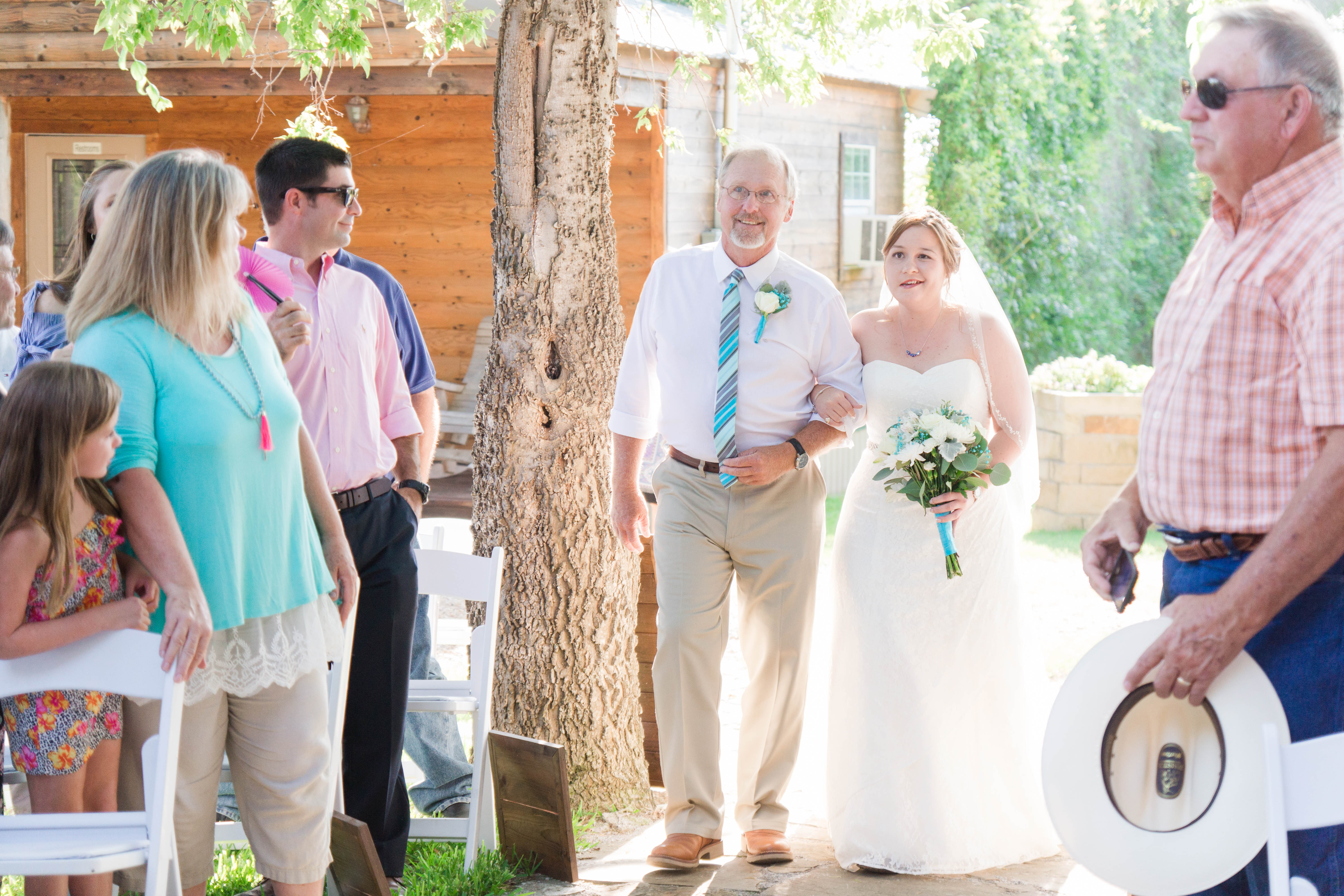 When we arrived, everyone was putting the final touches to the cabin where the reception was being held. The centerpieces doubled as the bridal and bridesmaids bouquets. Each place setting had a mason jar and champagne glasses for the toasts. The table runners, candle holders, drapes, and vases filled the room with turquoise giving this reception such a bright and airy feel. My fav! A projector was running pictures of the bride and groom from when they were babies to the present. Everything was just wonderful! The ceremony location, which is right next to the cabin, was lined with white chairs and wooden signs with 1 Corinthians 13:4-7 all along each row. Kira said it was a team effort to make each sign. Larry made the wood plaques and she painted the words on. So sweet! I imagine these will hold a place somewhere in the home they will share. Overlooking the alter, the trees providing the shade move with the breeze and create a sparkle when the sun shines through. Feels magical!
