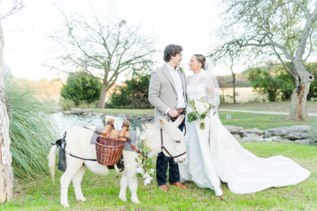Right after the ceremony, guests were greeted by one of the most unforgettable cocktail hours — beer-toting donkeys complete with little satchels. It was such a fun, whimsical touch that had everyone smiling. It fit the day perfectly! Elegant and romantic, but with plenty of personality woven in.