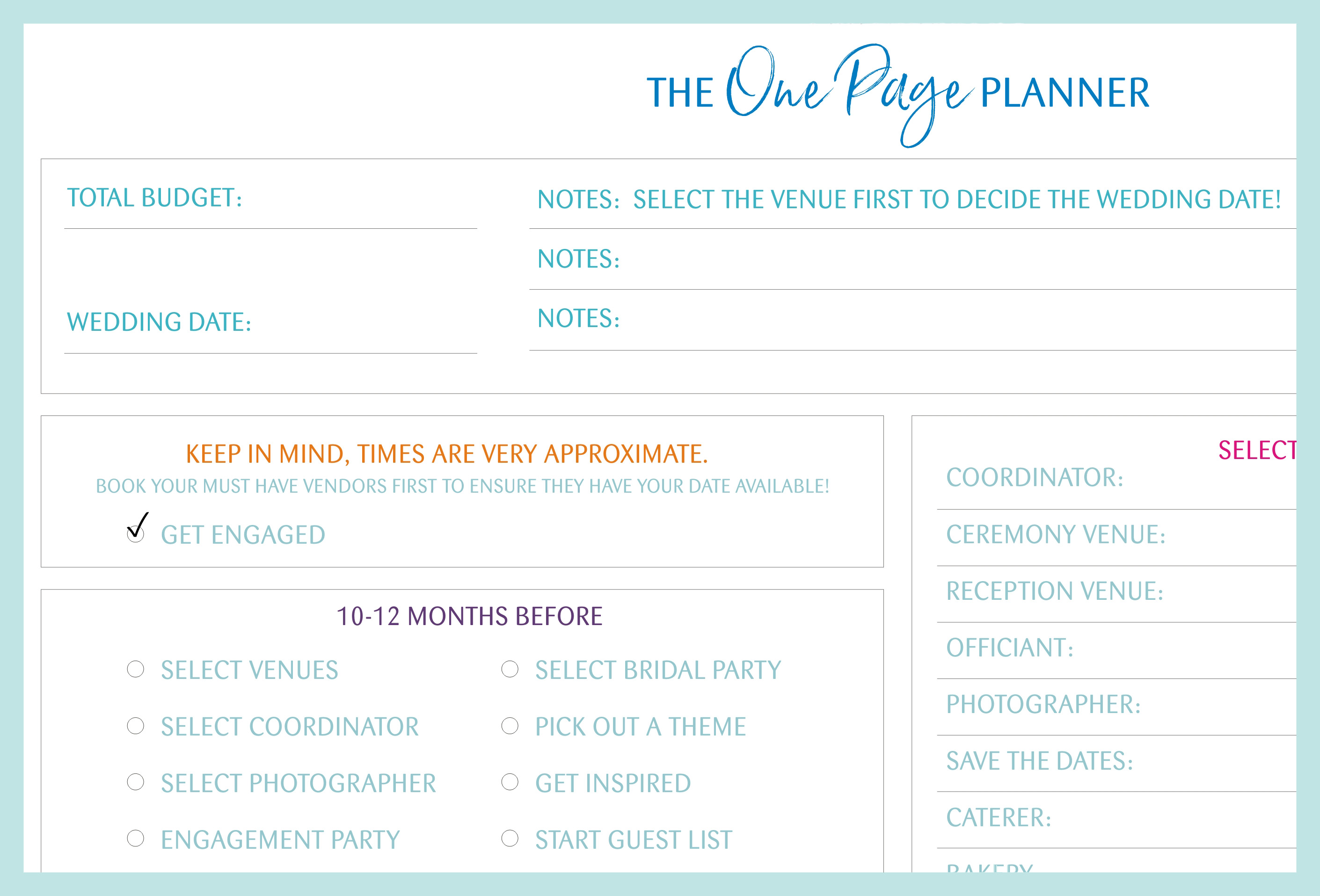 I was talking with one of my brides about how much goes into wedding planning. I know not everyone can afford a wedding coordinator to help them book vendors, make a timeline, etc. I myself was a diy bride and ran around pretty crazy since I had never planned a wedding before. What bride has? I could have greatly benefited from having some sort of guideline to go by. So I decided to make one. And I know there are VERY large planners out there and those are fun too! Please go get one of those because they are just fun and very helpful! But to have most everything on one page to overview is happier on my eyes. And I hope on yours too.