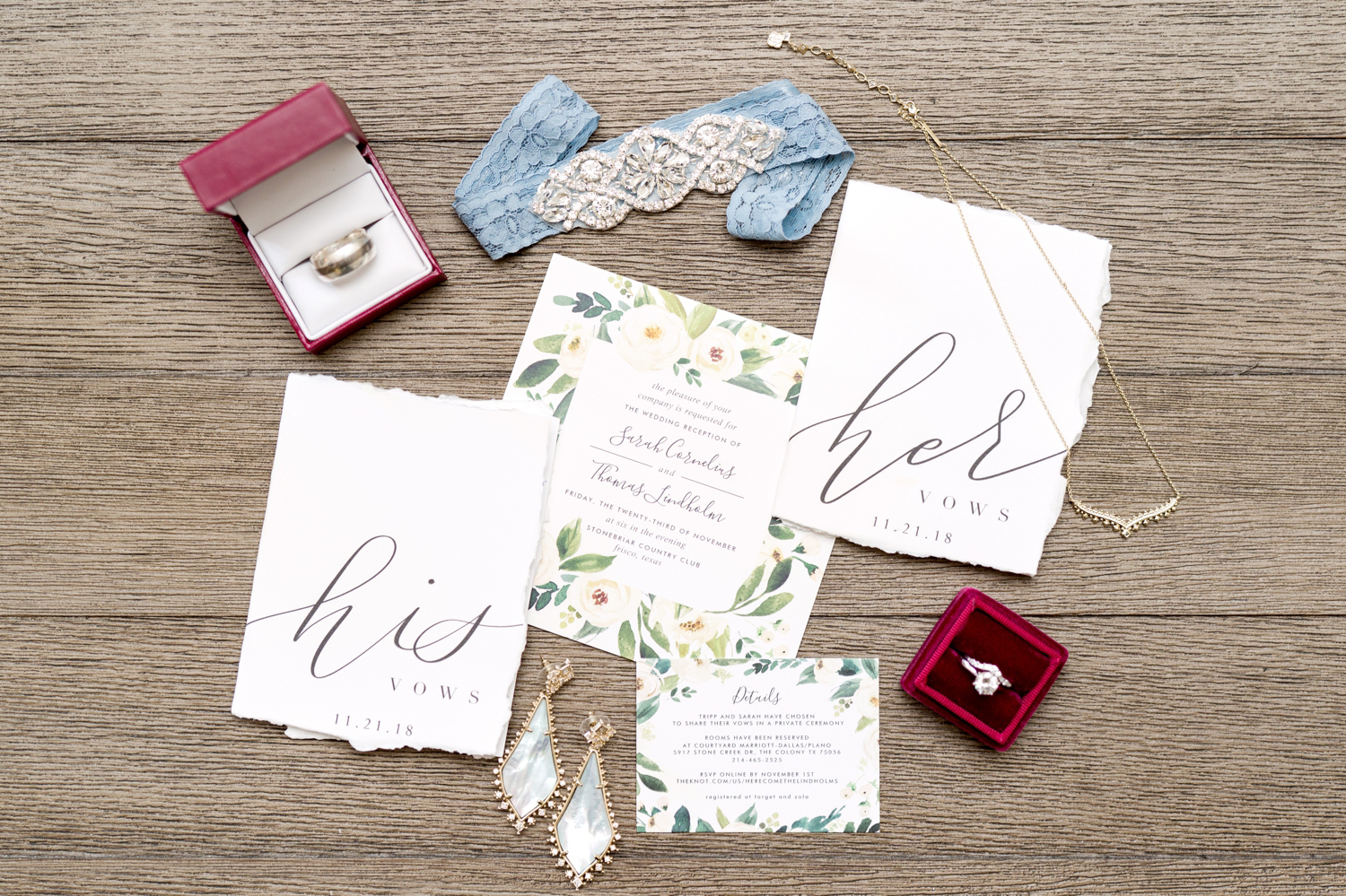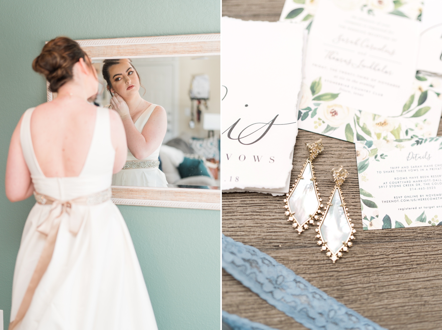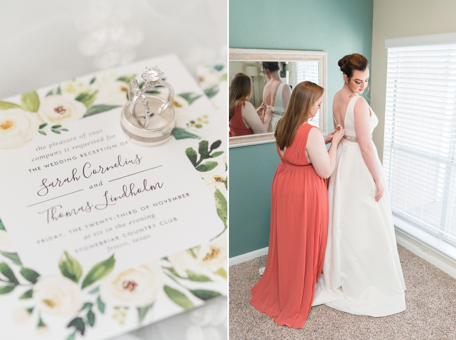 Sarah + Tripp started their marriage in San Fransico California just a few days before their reception! They traveled with a few of their close family members and were married in one of the most beautiful places, San Francisco City Hall. Since their ceremony had already taken place, our day started at their home! Sarah’s friend Emily was there to help Sarah put on the final touches. It was so sweet to watch Sarah help Tripp put on his. Everything about this couple is genuine and really shows how personal their relationship is. The Office, which is their favorite show, was on in the background and it was super important to them to have a few pictures of them and their babies. (You have to see their sweet kitties!) Now it was time to head to the Stonebriar Country Club in Frisco to celebrate their marriage with so many friends and family!